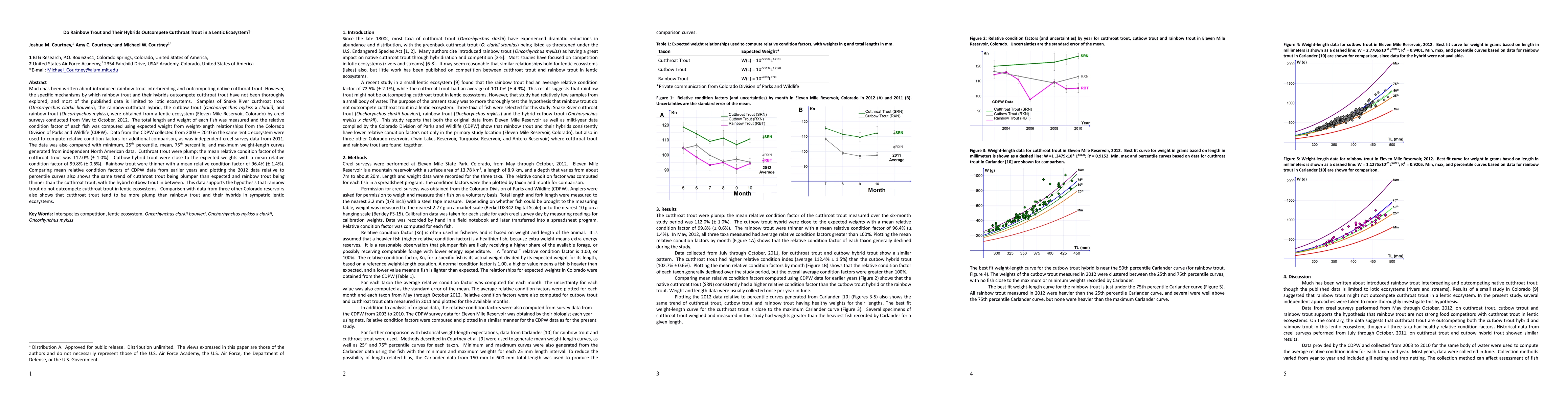 This study investigates whether rainbow trout and their hybrids outcompete native cutthroat trout in lentic ecosystems, finding that cutthroat trout maintain a plumper condition factor compared to rainbow trout and their hybrid cutbows. The results suggest that rainbow trout do not outcompete cutthroat trout in these environments.