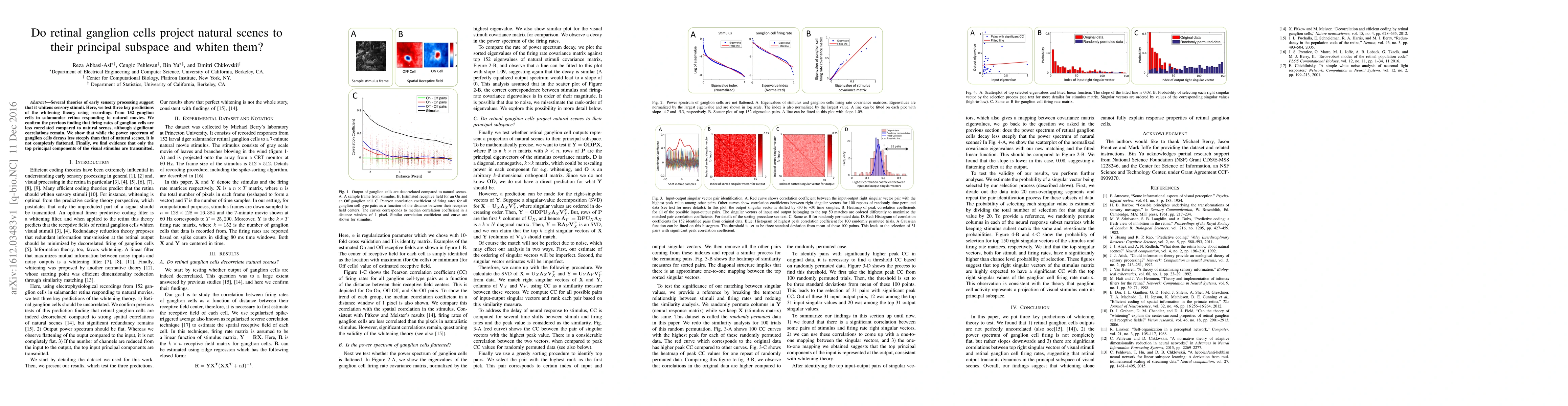 This study investigates whether retinal ganglion cells project natural scenes to their principal subspace and whiten them, confirming that ganglion cells have less correlated firing rates but still retain some correlations, and that only the top principal components of visual stimuli are transmitted.