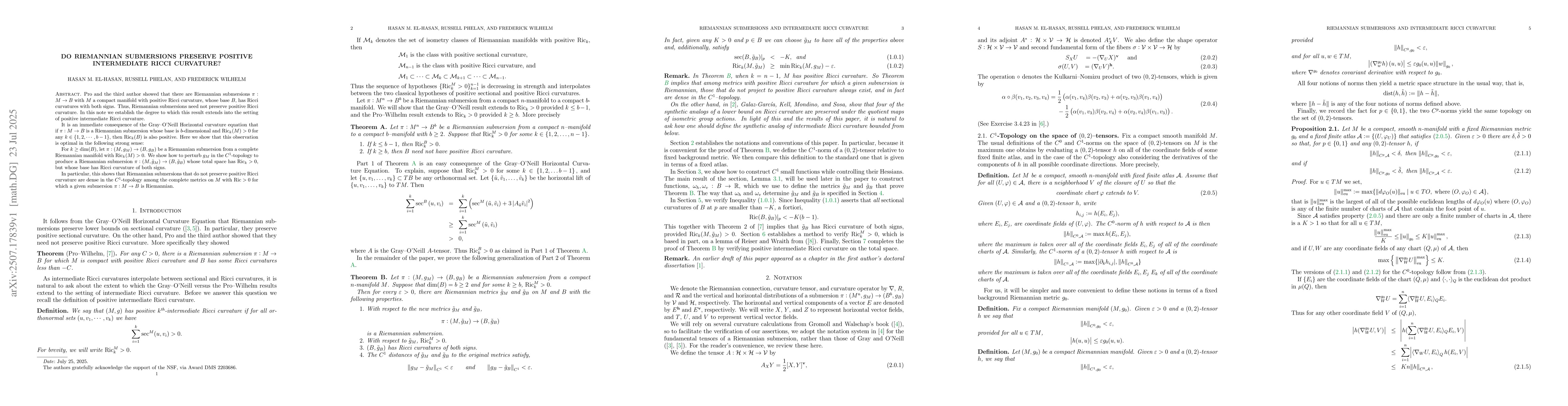Pro and the third author showed that there are Riemannian submersions $\pi: M \to B$ with $M$ a compact manifold with positive Ricci curvature, whose base $B$, has Ricci curvatures with both signs. Thus, Riemannian submersions need not preserve positive Ricci curvature. In this note we establish the degree to which this result extends into the setting of positive intermediate Ricci curvature. It is an immediate consequence of the Gray--O'Neill Horizontal curvature equation that if $\pi: M\to B$ is a Riemannian submersion whose base is $b$-dimensional and $\mathrm{Ric}_{k}(M) >0$ for any $k \in \{ 1,2,\cdots, b-1\}$, then $ \mathrm{Ric}_{k}(B)$ is also positive. Here we show that this observation is optimal in the following strong sense: For $k \geq \mathrm{dim}(B)$, let $\pi: (M,g_M) \to (B,g_B)$ be a Riemannian submersion from a complete Riemannian manifold with $\mathrm{Ric}_{k}(M) >0$. We show how to perturb $g_M$ in the $C^1$-topology to produce a Riemannian submersion $\pi: (M,\tilde{g}_M) \to (B,\tilde{g}_B)$ whose total space has $\mathrm{Ric}_{k} >0$, but whose base has Ricci curvature of both signs. In particular, this shows that Riemannian submersions that do not preserve positive Ricci curvature are dense in the $C^1$-topology among the complete metrics on $M$ with $\mathrm{Ric}>0$ for which a given submersion $\pi: M\to B$ is Riemannian.