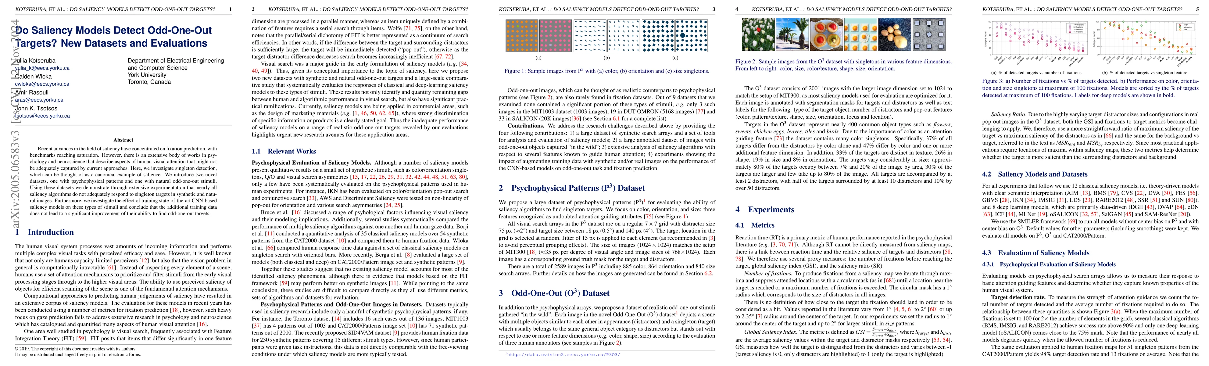 Recent advances in the field of saliency have concentrated on fixation prediction, with benchmarks reaching saturation. However, there is an extensive body of works in psychology and neuroscience that describe aspects of human visual attention that might not be adequately captured by current approaches. Here, we investigate singleton detection, which can be thought of as a canonical example of salience. We introduce two novel datasets, one with psychophysical patterns and one with natural odd-one-out stimuli. Using these datasets we demonstrate through extensive experimentation that nearly all saliency algorithms do not adequately respond to singleton targets in synthetic and natural images. Furthermore, we investigate the effect of training state-of-the-art CNN-based saliency models on these types of stimuli and conclude that the additional training data does not lead to a significant improvement of their ability to find odd-one-out targets. Datasets are available at http://data.nvision2.eecs.yorku.ca/P3O3/.