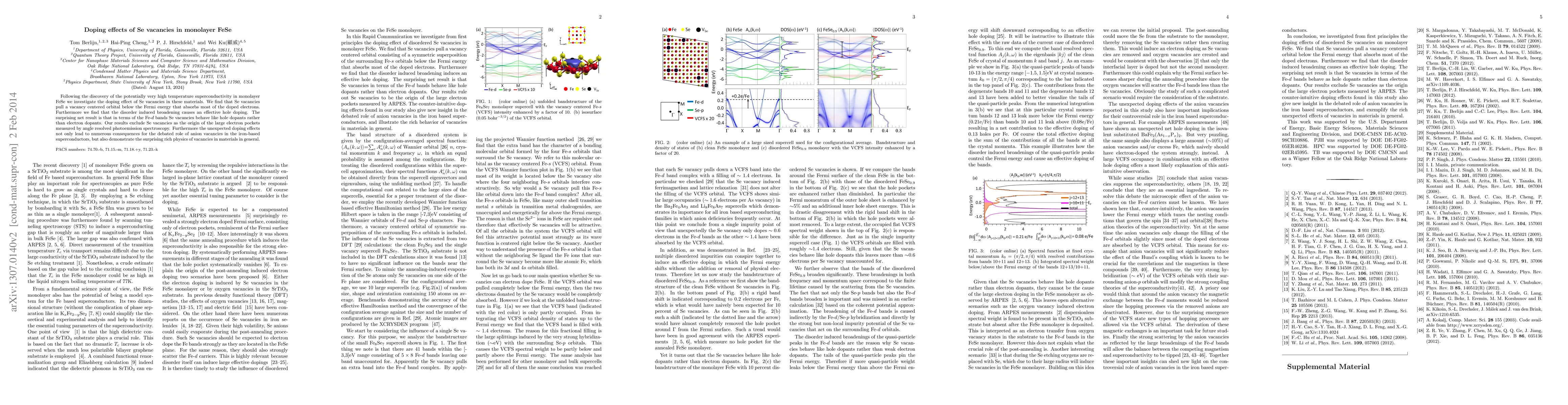 Following the discovery of the potentially very high temperature superconductivity in monolayer FeSe we investigate the doping effect of Se vacancies in these materials. We find that Se vacancies pull a vacancy centered orbital below the Fermi energy that absorbs most of the doped electrons. Furthermore we find that the disorder induced broadening causes an effective hole doping. The surprising net result is that in terms of the band structure Se vacancies behave like hole dopants rather than electron dopants. Our results exclude Se vacancies as the origin of the large electron pockets measured by angle resolved photoemission spectroscopy.