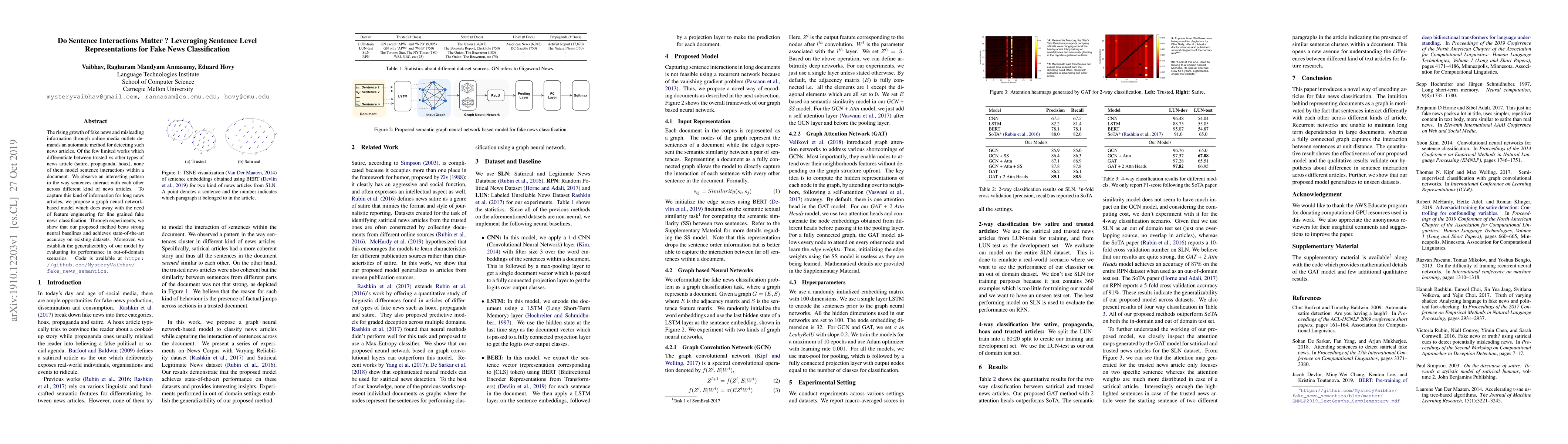 This paper proposes a graph neural network model to capture sentence interactions for fake news classification, achieving state-of-the-art accuracy and demonstrating generalizability across different datasets. The method eliminates the need for feature engineering, outperforming strong neural baselines.