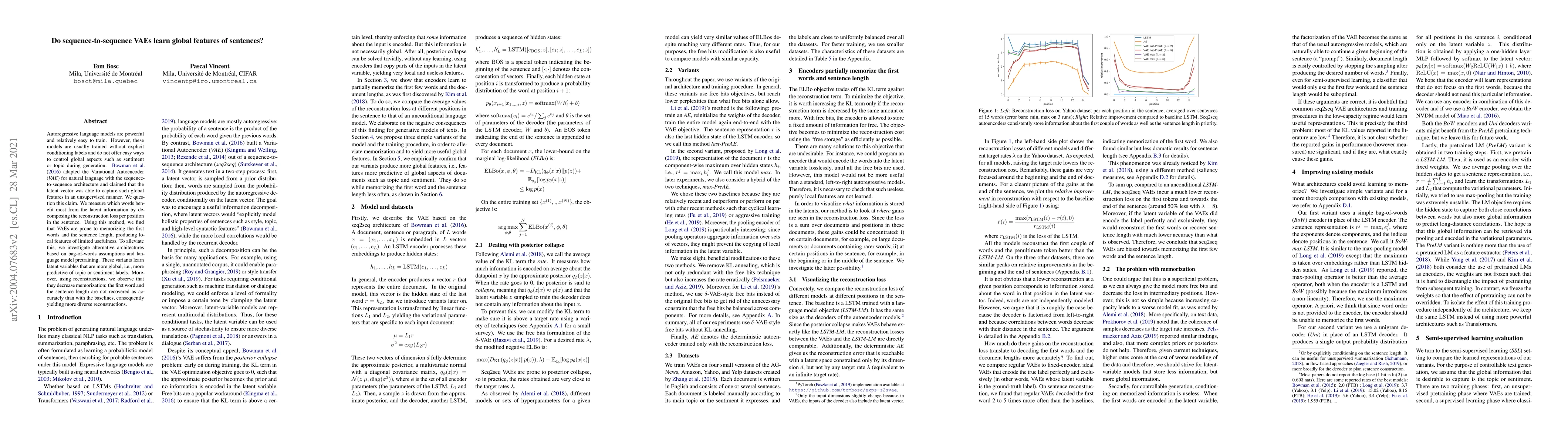 Autoregressive language models are powerful and relatively easy to train. However, these models are usually trained without explicit conditioning labels and do not offer easy ways to control global aspects such as sentiment or topic during generation. Bowman & al. (2016) adapted the Variational Autoencoder (VAE) for natural language with the sequence-to-sequence architecture and claimed that the latent vector was able to capture such global features in an unsupervised manner. We question this claim. We measure which words benefit most from the latent information by decomposing the reconstruction loss per position in the sentence. Using this method, we find that VAEs are prone to memorizing the first words and the sentence length, producing local features of limited usefulness. To alleviate this, we investigate alternative architectures based on bag-of-words assumptions and language model pretraining. These variants learn latent variables that are more global, i.e., more predictive of topic or sentiment labels. Moreover, using reconstructions, we observe that they decrease memorization: the first word and the sentence length are not recovered as accurately than with the baselines, consequently yielding more diverse reconstructions.