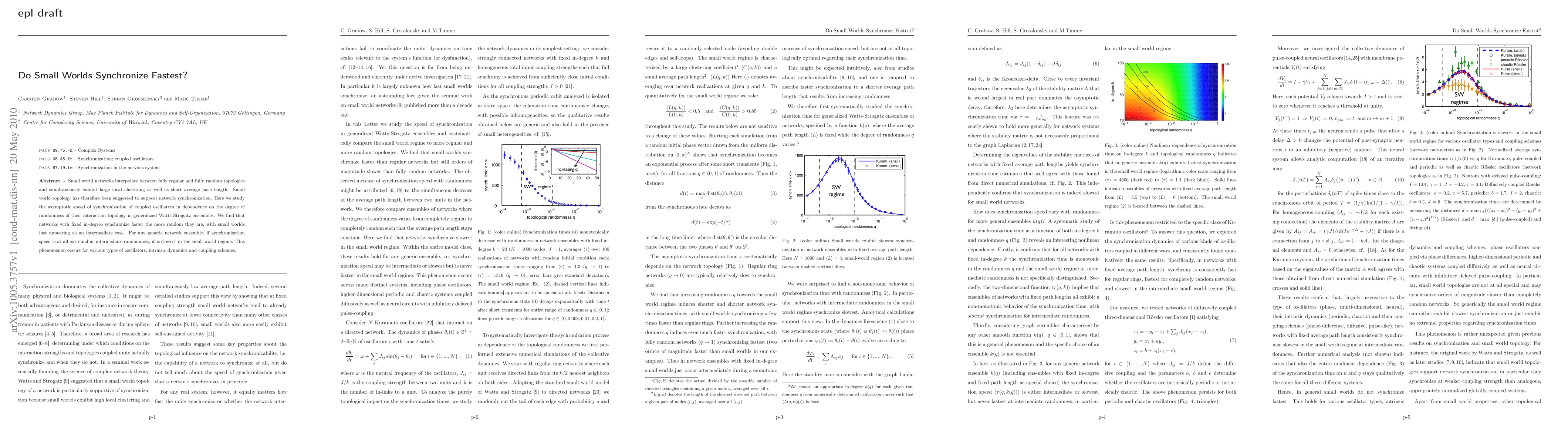 Small world networks synchronize fastest when they have more random interaction topologies, but even in this case, synchronization speed is still slower than in fully regular or random networks.
