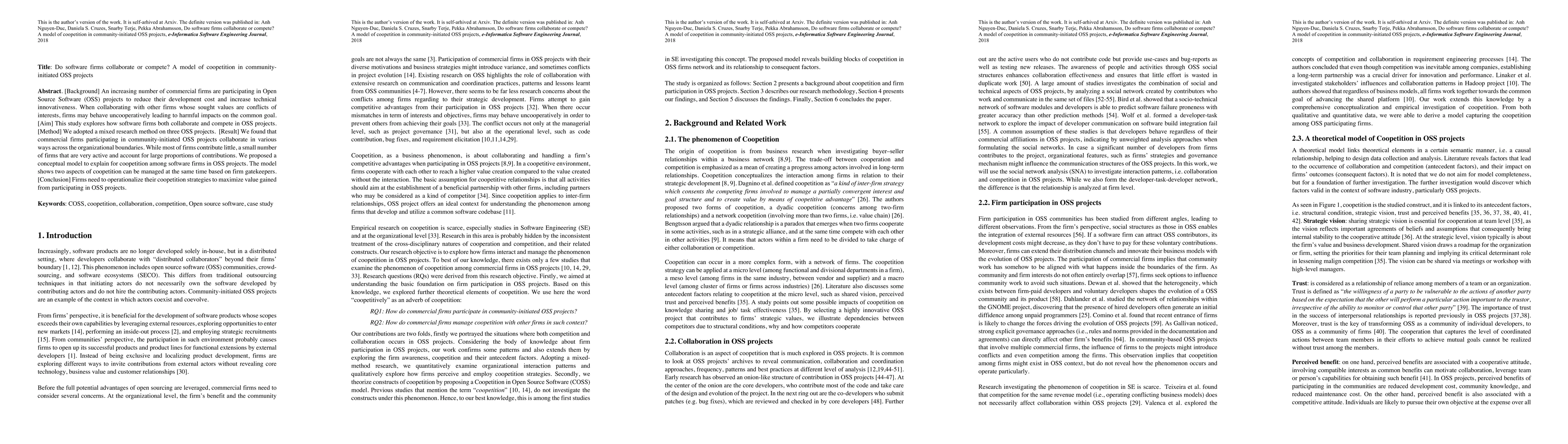 This study investigates how commercial firms collaborate and compete in community-initiated Open Source Software (OSS) projects, revealing that while most firms contribute minimally, a few active firms dominate contributions. A conceptual model is proposed to explain coopetition dynamics, emphasizing the role of firm gatekeepers in managing both cooperation and competition.