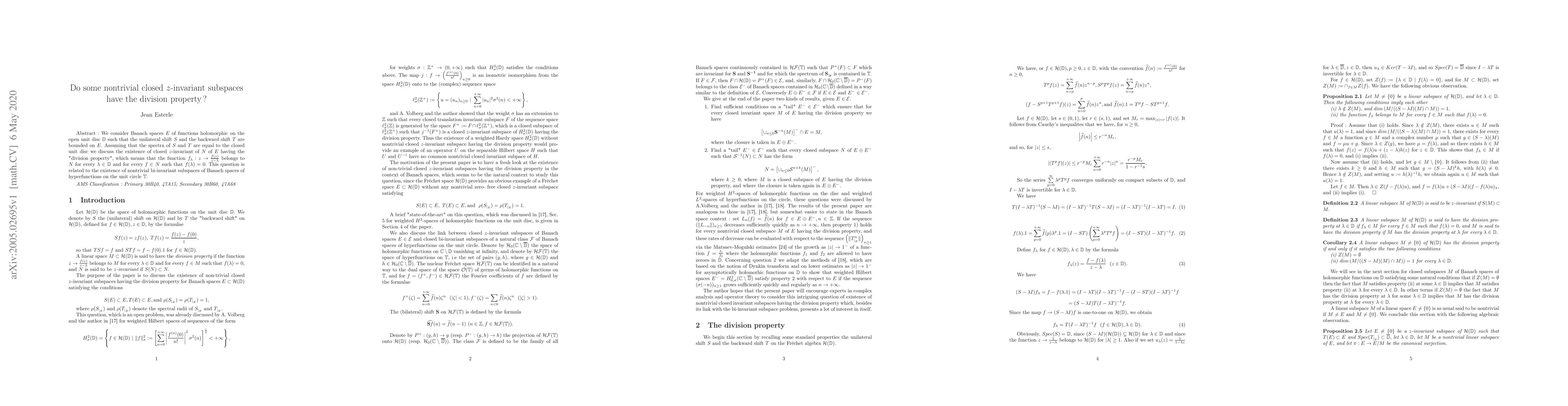 We consider Banach spaces E of functions holomorphic on the open unit disc D such that the unilateral shift S and the backward shift T are bounded on E. Assuming that the spectra of S and T are equal to the closed unit disc we discuss the existence of closed z-invariant of N of E having the "division property", which means that the function f $\lambda$ : z $\rightarrow$ f (z)/ z--$\lambda$ belongs to N for every $\lambda$ $\in$ D and for every f $\in$ N such that f ($\lambda$) = 0. This question is related to the existence of nontrivial bi-invariant subspaces of Banach spaces of hyperfunctions on the unit circle T.