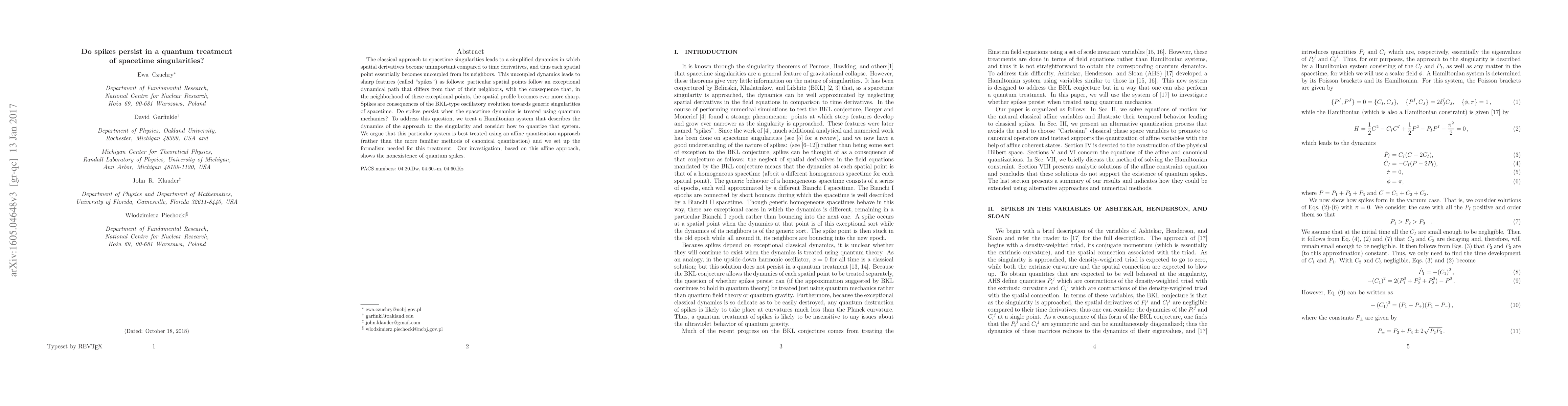 The classical approach to spacetime singularities leads to a simplified dynamics in which spatial derivatives become unimportant compared to time derivatives, and thus each spatial point essentially becomes uncoupled from its neighbors. This uncoupled dynamics leads to sharp features (called "spikes") as follows: particular spatial points follow an exceptional dynamical path that differs from that of their neighbors, with the consequence that, in the neighborhood of these exceptional points, the spatial profile becomes ever more sharp. Spikes are consequences of the BKL-type oscillatory evolution towards generic singularities of spacetime. Do spikes persist when the spacetime dynamics is treated using quantum mechanics? To address this question, we treat a Hamiltonian system that describes the dynamics of the approach to the singularity and consider how to quantize that system. We argue that this particular system is best treated using an affine quantization approach (rather than the more familiar methods of canonical quantization) and we set up the formalism needed for this treatment. Our investigation, based on this affine approach, shows the nonexistence of quantum spikes.