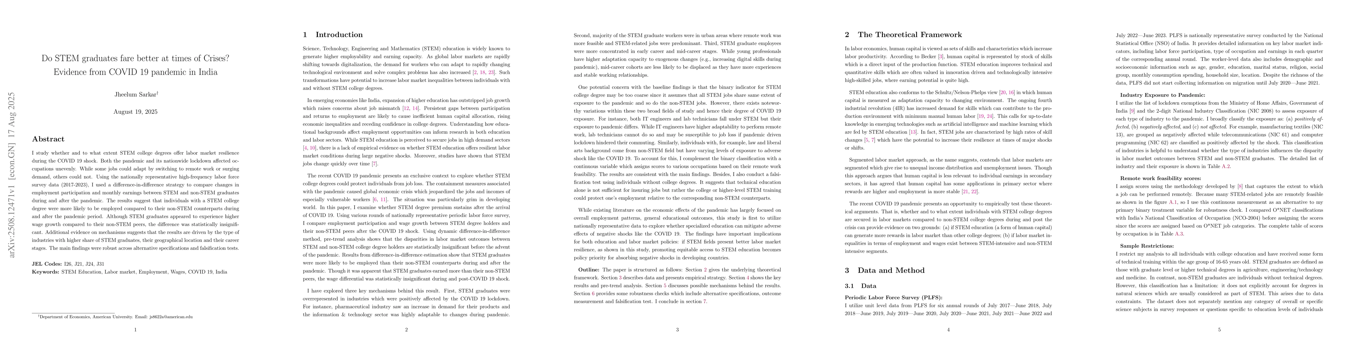 I study whether and to what extent STEM college degrees offer labor market resilience during the COVID 19 shock. Both the pandemic and its nationwide lockdown affected occupations unevenly. While some jobs could adapt by switching to remote work or surging demand, others could not. Using the nationally representative high-frequency labor force survey data (2017-2023), I used a difference-in-difference strategy to compare changes in employment participation and monthly earnings between STEM and non-STEM graduates during and after the pandemic. The results suggest that individuals with a STEM college degree were more likely to be employed compared to their non-STEM counterparts during and after the pandemic period. Although STEM graduates appeared to experience higher wage growth compared to their non-STEM peers, the difference was statistically insignificant. Additional evidence on mechanisms suggests that the results are driven by the type of industries with higher share of STEM graduates, their geographical location and their career stages. The main findings were robust across alternative specifications and falsification tests.