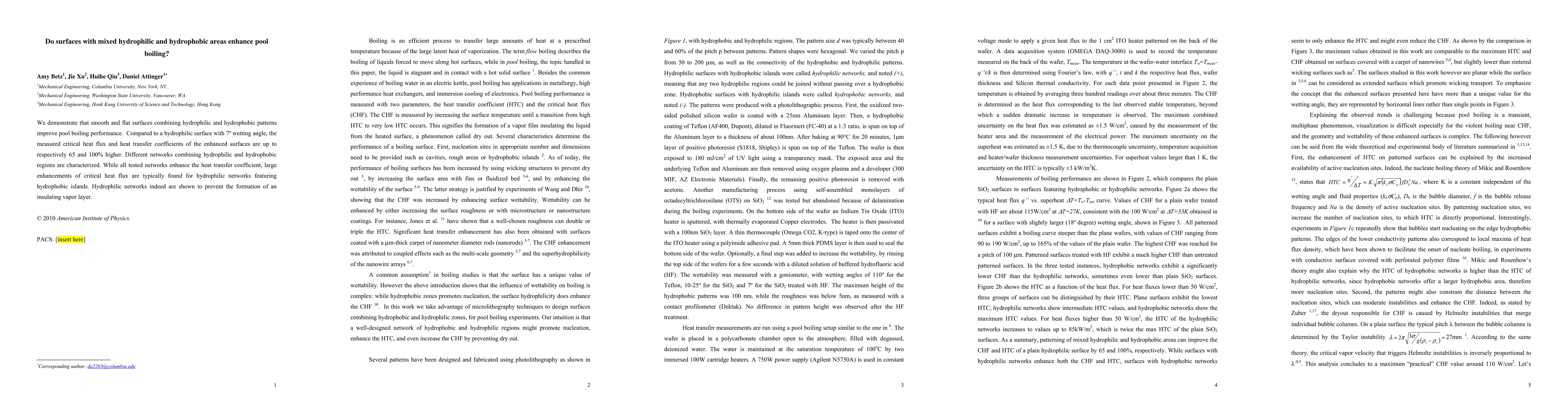 This study finds that surfaces with mixed hydrophilic and hydrophobic patterns significantly improve pool boiling performance, with critical heat flux and heat transfer coefficients up to 65% and 100% higher, respectively, compared to purely hydrophilic surfaces. The best results are achieved with hydrophilic networks featuring hydrophobic islands, which prevent insulating vapor layer formation.