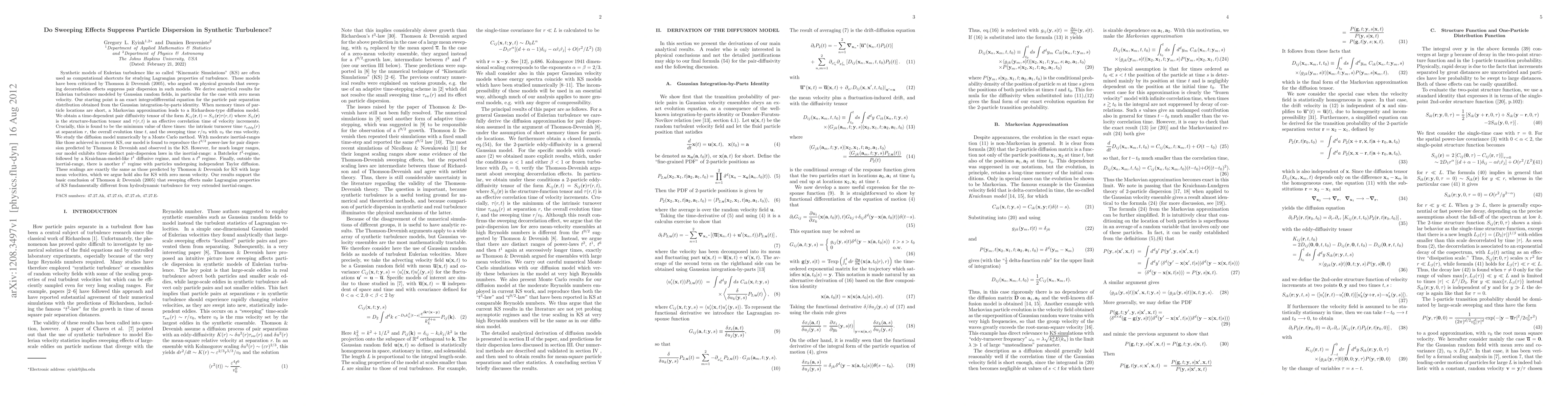 Synthetic models of Eulerian turbulence like so called "Kinematic Simulations" (KS) have been criticized by Thomson & Devenish (TD) (2005), who argued that sweeping decorrelation effects suppress pair dispersion in such models. We derive analytical results for Eulerian turbulence modeled by Gaussian random fields for the case with zero mean velocity. Our starting point is an exact integrodifferential equation for the particle pair separation distribution. When memory times of particle locations are short, a Markovian approximation leads to a Richardson-type diffusion model. We obtain a diffusivity tensor of the form $K_{ij}(r,t)=S_{ij}(r)\tau(r,t)$ where $S_{ij}(r)$ is the structure-function tensor and $\tau(r,t)$ is an effective correlation time of velocity increments. This is found to be the minimum value of three times: the intrinsic turnover time $\tau_{eddy}(r)$ at separation $r$, the overall evolution time $t,$ and the sweeping time $r/v_0$ with $v_0$ the rms velocity. We study the diffusion model numerically by a Monte Carlo method. With moderate inertial-ranges like those achieved in current KS, our model is found to reproduce the $t^{9/2}$ power-law for pair dispersion predicted by TD and observed in the KS. However, for much longer ranges, our model exhibits three distinct pair-dispersion laws in the inertial-range: a Batchelor $t^2$-regime, followed by a $t^1$ diffusive regime, and then a $t^6$ regime. Finally, outside the inertial-range, there is another $t^1$ regime with particles undergoing independent Taylor diffusion. These scalings are exactly the same as those predicted by TD for KS with large mean velocities, which we argue hold also for KS with zero mean velocity. Our results support the basic conclusion that sweeping effects make Lagrangian properties of KS fundamentally different from hydrodynamic turbulence for very extended inertial-ranges.