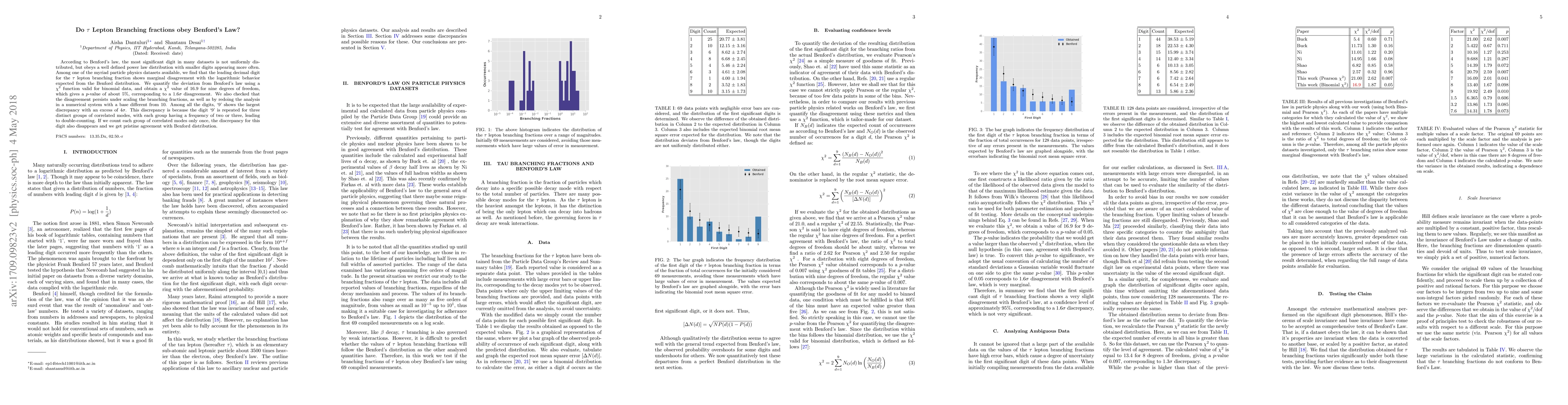 A study found that tau lepton branching fractions do not strictly follow Benford's law, with a significant deviation detected, particularly for the digit '9', indicating potential double-counting of correlated modes.