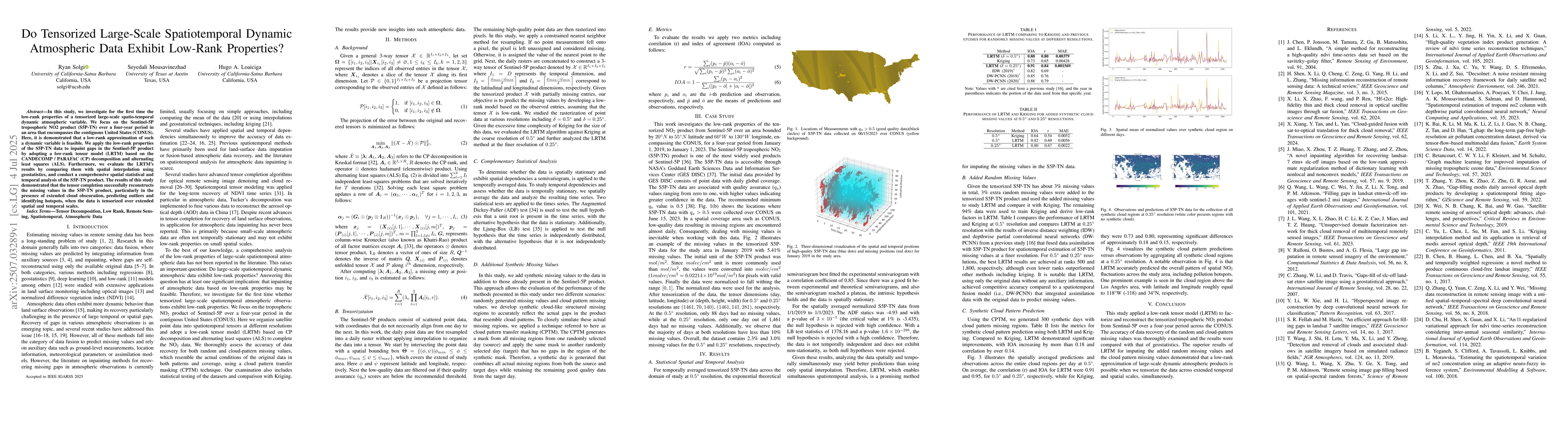 In this study, we investigate for the first time the low-rank properties of a tensorized large-scale spatio-temporal dynamic atmospheric variable. We focus on the Sentinel-5P tropospheric NO2 product (S5P-TN) over a four-year period in an area that encompasses the contiguous United States (CONUS). Here, it is demonstrated that a low-rank approximation of such a dynamic variable is feasible. We apply the low-rank properties of the S5P-TN data to inpaint gaps in the Sentinel-5P product by adopting a low-rank tensor model (LRTM) based on the CANDECOMP / PARAFAC (CP) decomposition and alternating least squares (ALS). Furthermore, we evaluate the LRTM's results by comparing them with spatial interpolation using geostatistics, and conduct a comprehensive spatial statistical and temporal analysis of the S5P-TN product. The results of this study demonstrated that the tensor completion successfully reconstructs the missing values in the S5P-TN product, particularly in the presence of extended cloud obscuration, predicting outliers and identifying hotspots, when the data is tensorized over extended spatial and temporal scales.