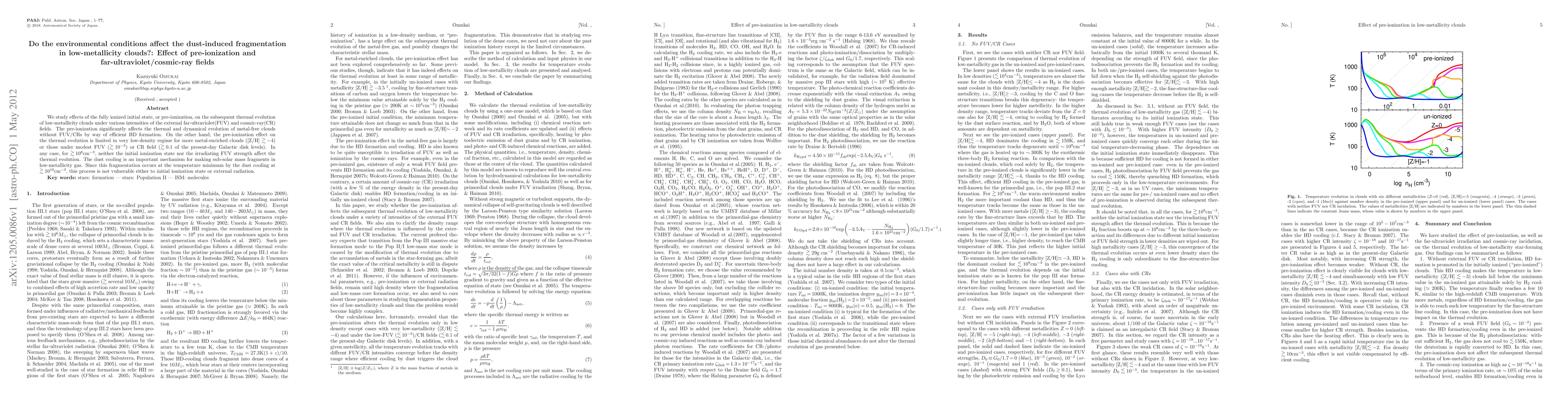 The research examines how pre-ionization and external far-ultraviolet/cosmic-ray fields influence the thermal evolution of low-metallicity clouds. Key findings indicate that pre-ionization significantly impacts metal-free clouds without FUV/CRs via efficient HD formation. However, for more metal-enriched clouds or those under modest FUV/CR fields, its effect is limited. Dust cooling is crucial for forming sub-solar mass fragments in low-metallicity gas, independent of initial ionization state or external radiation, especially at densities above $10^{10} ext{ cm}^{-3}$.