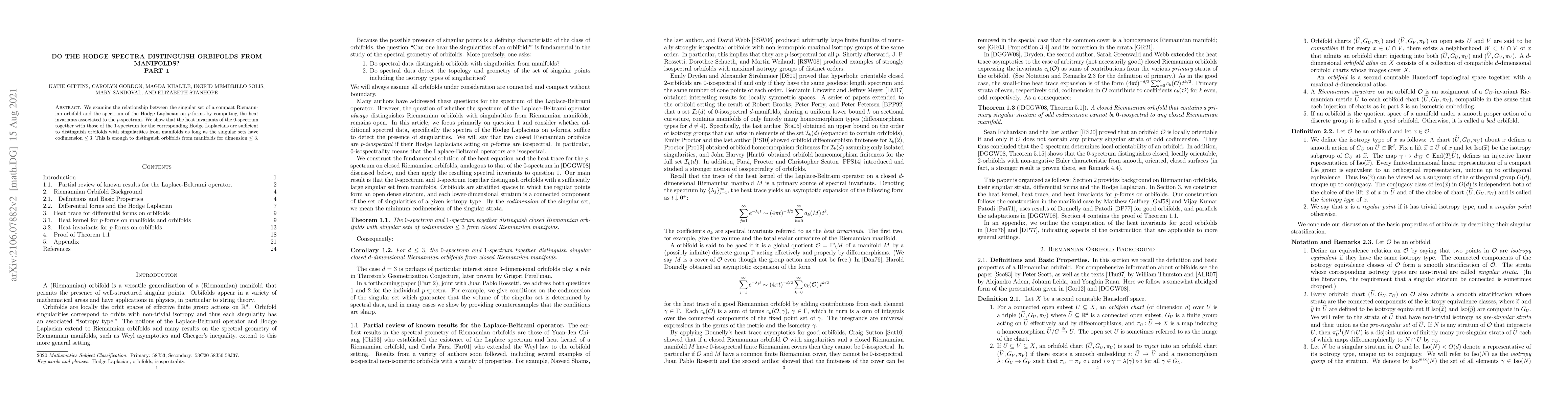 We examine the relationship between the singular set of a compact Riemannian orbifold and the spectrum of the Hodge Laplacian on $p$-forms by computing the heat invariants associated to the $p$-spectrum. We show that the heat invariants of the $0$-spectrum together with those of the $1$-spectrum for the corresponding Hodge Laplacians are sufficient to distinguish orbifolds with singularities from manifolds as long as the singular sets have codimension $\le 3.$ This is enough to distinguish orbifolds from manifolds for dimension $\le 3.$