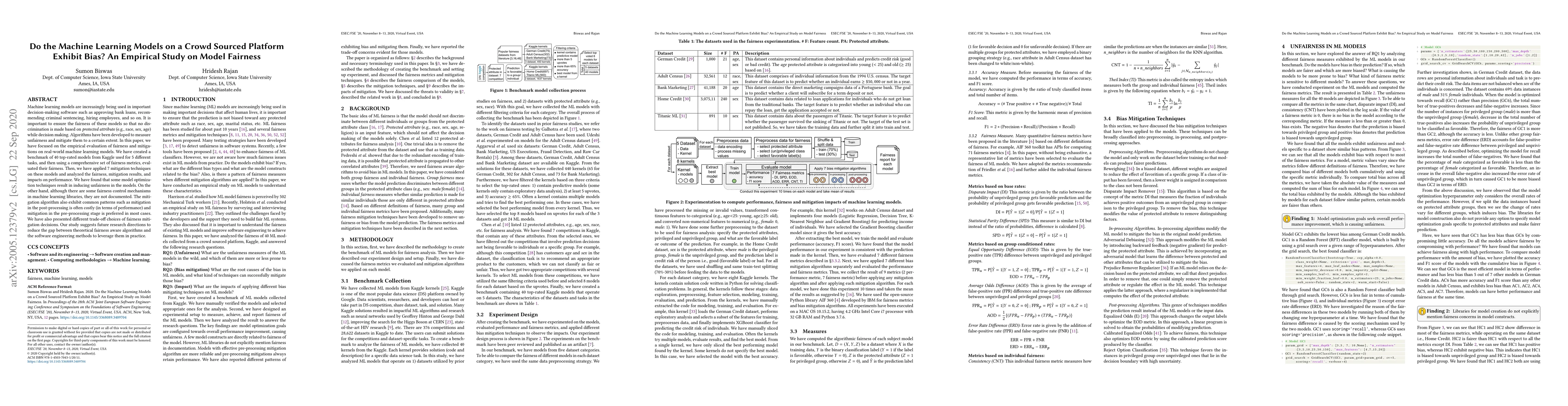 Machine learning models are increasingly being used in important decision-making software such as approving bank loans, recommending criminal sentencing, hiring employees, and so on. It is important to ensure the fairness of these models so that no discrimination is made based on protected attribute (e.g., race, sex, age) while decision making. Algorithms have been developed to measure unfairness and mitigate them to a certain extent. In this paper, we have focused on the empirical evaluation of fairness and mitigations on real-world machine learning models. We have created a benchmark of 40 top-rated models from Kaggle used for 5 different tasks, and then using a comprehensive set of fairness metrics, evaluated their fairness. Then, we have applied 7 mitigation techniques on these models and analyzed the fairness, mitigation results, and impacts on performance. We have found that some model optimization techniques result in inducing unfairness in the models. On the other hand, although there are some fairness control mechanisms in machine learning libraries, they are not documented. The mitigation algorithm also exhibit common patterns such as mitigation in the post-processing is often costly (in terms of performance) and mitigation in the pre-processing stage is preferred in most cases. We have also presented different trade-off choices of fairness mitigation decisions. Our study suggests future research directions to reduce the gap between theoretical fairness aware algorithms and the software engineering methods to leverage them in practice.