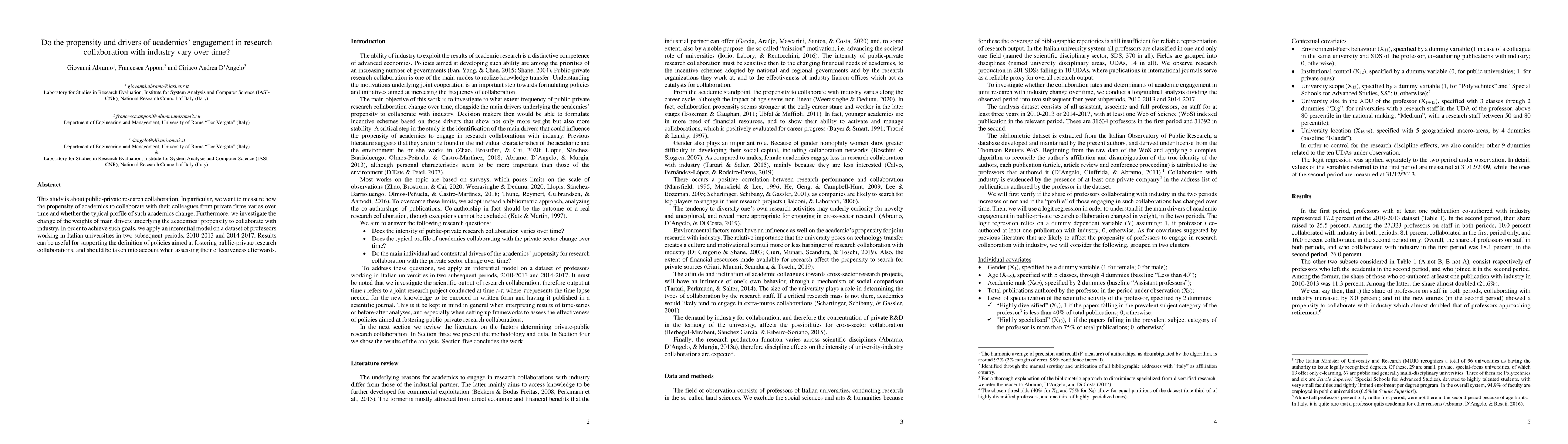 This study examines the temporal variations in academics' propensity to collaborate with industry and the evolving profiles of such academics, using data from Italian university professors in two periods: 2010-2013 and 2014-2017. It also investigates shifts in the key drivers influencing these collaborations, aiming to inform policies that promote public-private research partnerships.
