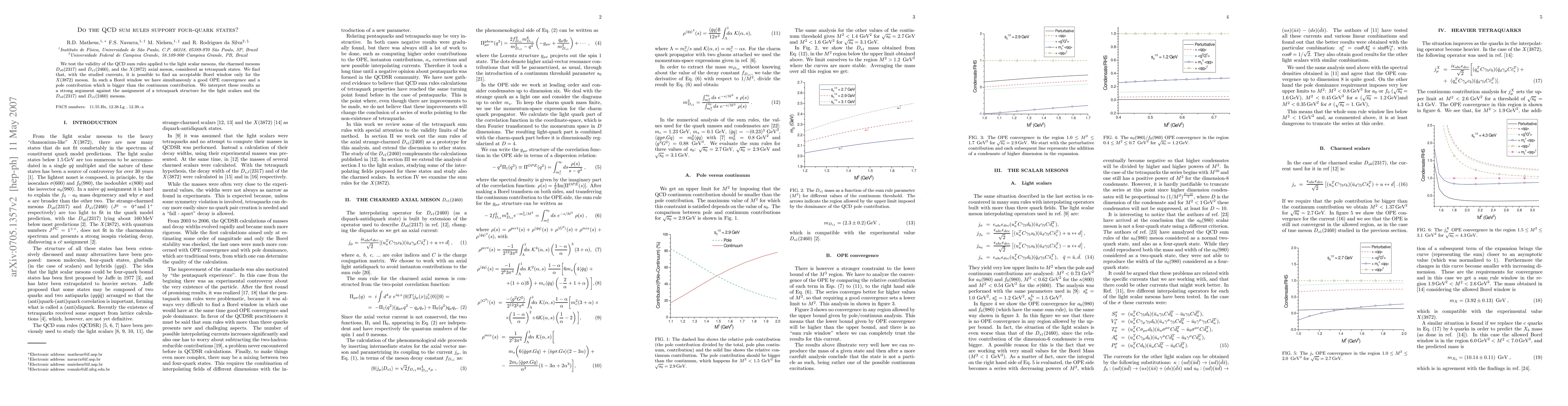 We test the validity of the QCD sum rules applied to the light scalar mesons, the charmed mesons $D_{s0}(2317)$ and $D_{s1} (2460)$, and the X(3872) axial meson, considered as tetraquark states. We find that, with the studied currents, it is possible to find an acceptable Borel window only for the X(3872) meson. In such a Borel window we have simultaneouly a good OPE convergence and a pole contribution which is bigger than the continuum contribution. We interpret these results as a strong argument against the assignment of a tetraquark structure for the light scalars and the $D_{s0}(2317)$ and $D_{s1} (2460)$ mesons.