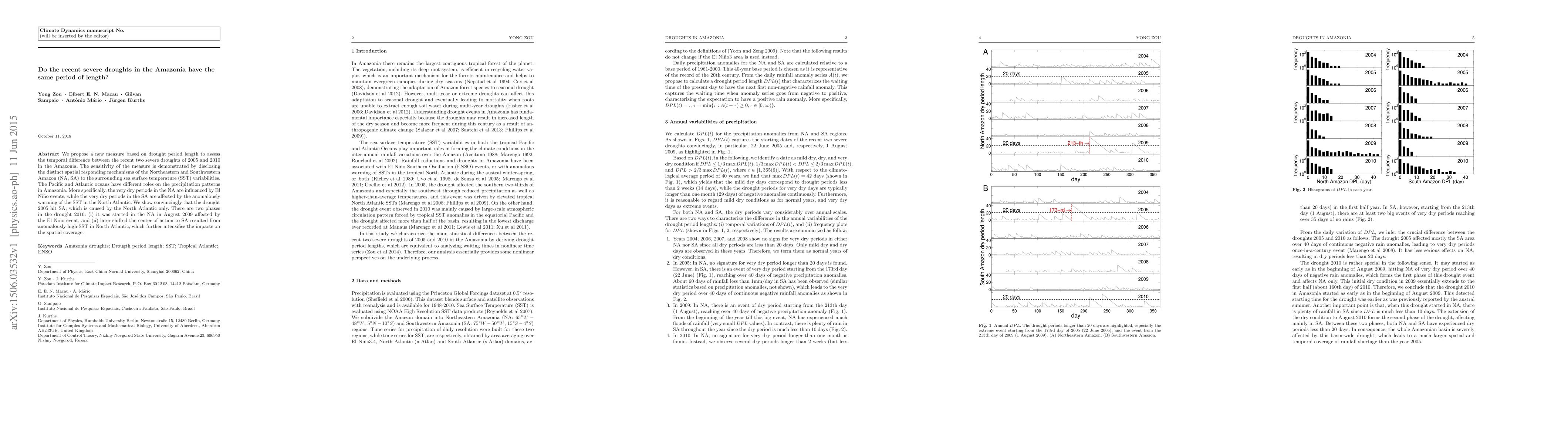 We propose a new measure based on drought period length to assess the temporal difference between the recent two severe droughts of 2005 and 2010 in the Amazonia. The sensitivity of the measure is demonstrated by disclosing the distinct spatial responding mechanisms of the Northeastern and Southwestern Amazon (NA, SA) to the surrounding sea surface temperature (SST) variabilities. The Pacific and Atlantic oceans have different roles on the precipitation patterns in Amazonia. More specifically, the very dry periods in the NA are influenced by El Ni\~no events, while the very dry periods in the SA are affected by the anomalously warming of the SST in the North Atlantic. We show convincingly that the drought 2005 hit SA, which is caused by the North Atlantic only. There are two phases in the drought 2010: (i) it was started in the NA in August 2009 affected by the El Ni\~no event, and (ii) later shifted the center of action to SA resulted from anomalously high SST in North Atlantic, which further intensifies the impacts on the spatial coverage.