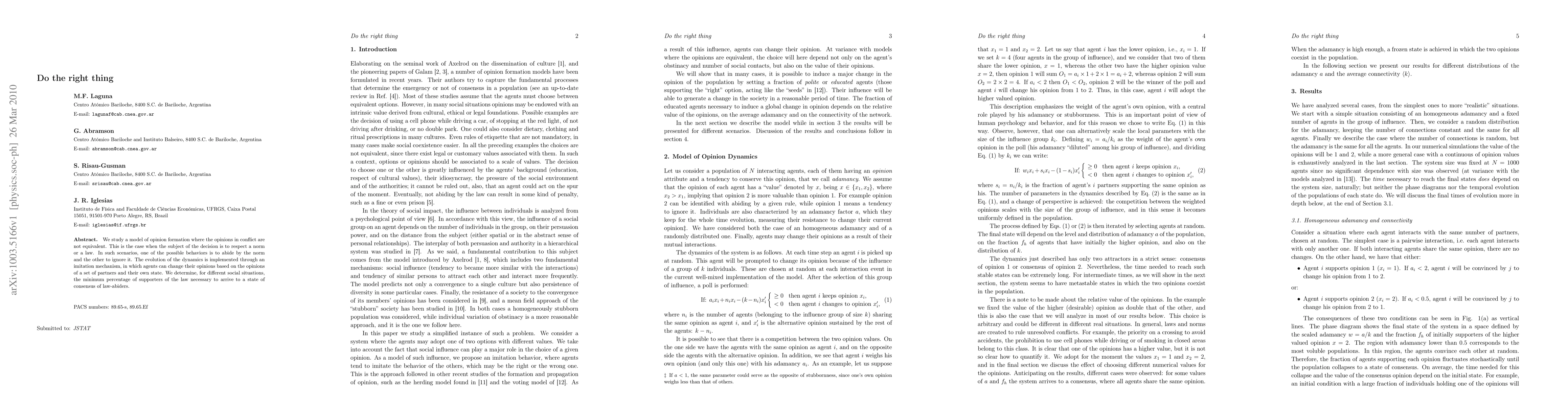 We study a model of opinion formation where the opinions in conflict are not equivalent. This is the case when the subject of the decision is to respect a norm or a law. In such scenarios, one of the possible behaviors is to abide by the norm and the other to ignore it. The evolution of the dynamics is implemented through an imitation mechanism, in which agents can change their opinions based on the opinions of a set of partners and their own state. We determine, for different social situations, the minimum percentage of supporters of the law necessary to arrive at a state of consensus of law abiders.