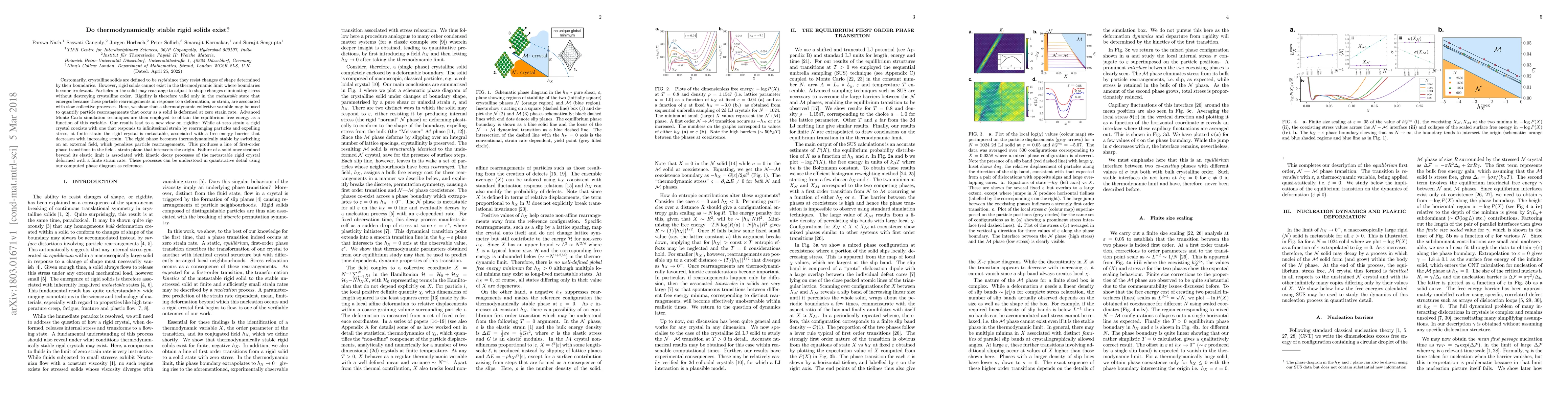 Customarily, crystalline solids are defined to be {\em rigid} since they resist changes of shape determined by their boundaries. However, rigid solids cannot exist in the thermodynamic limit where boundaries become irrelevant. Particles in the solid may rearrange to adjust to shape changes eliminating stress without destroying crystalline order. Rigidity is therefore valid only in the {\em metastable} state that emerges because these particle rearrangements in response to a deformation, or strain, are associated with slow collective processes. Here, we show that a thermodynamic collective variable may be used to quantify particle rearrangements that occur as a solid is deformed at zero strain rate. Advanced Monte Carlo simulation techniques are then employed to obtain the equilibrium free energy as a function of this variable. Our results lead to a new view on rigidity: While at zero strain a rigid crystal coexists with one that responds to infinitesimal strain by rearranging particles and expelling stress, at finite strain the rigid crystal is metastable, associated with a free energy barrier that decreases with increasing strain. The rigid phase becomes thermodynamically stable by switching on an external field, which penalises particle rearrangements. This produces a line of first-order phase transitions in the field - strain plane that intersects the origin. Failure of a solid once strained beyond its elastic limit is associated with kinetic decay processes of the metastable rigid crystal deformed with a finite strain rate. These processes can be understood in quantitative detail using our computed phase diagram as reference.