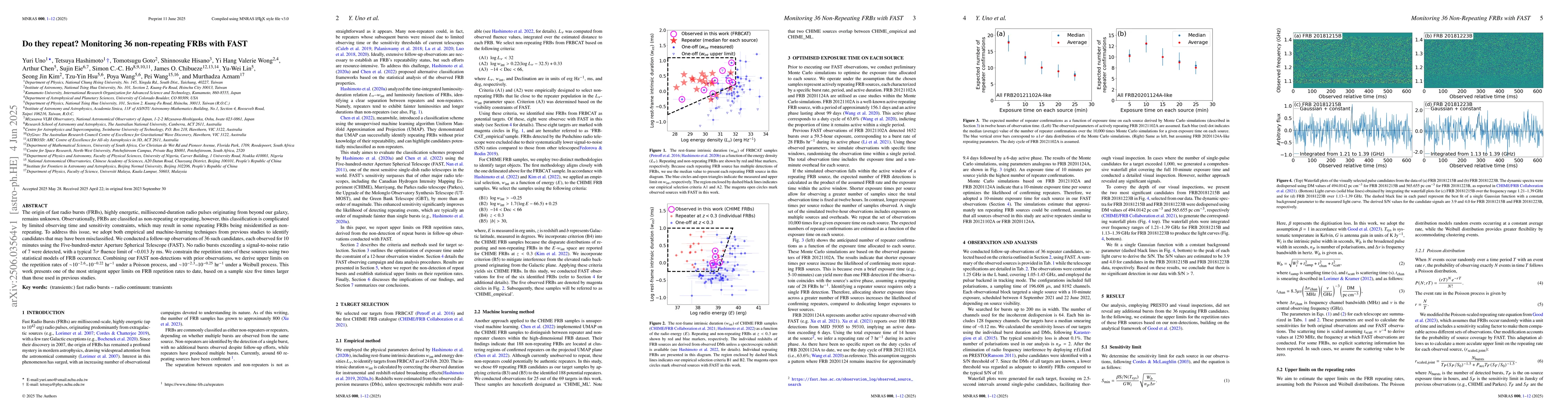 This study monitored 36 non-repeating fast radio bursts for repetition using the FAST telescope, setting stringent upper limits on their repetition rates.