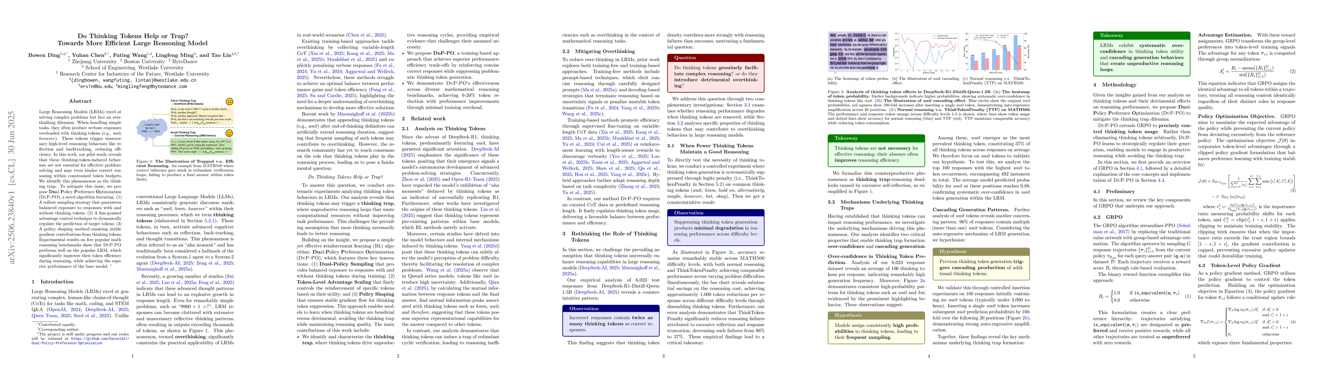 Large Reasoning Models often generate excessive, verbose responses with 'thinking tokens' that aren't necessary for problem-solving, causing inefficiency. The proposed Dual Policy Preference Optimization (DuP-PO) algorithm, featuring rollout sampling, fine-grained advantage control, and policy shaping, significantly improves token efficiency and performance on math reasoning tasks.