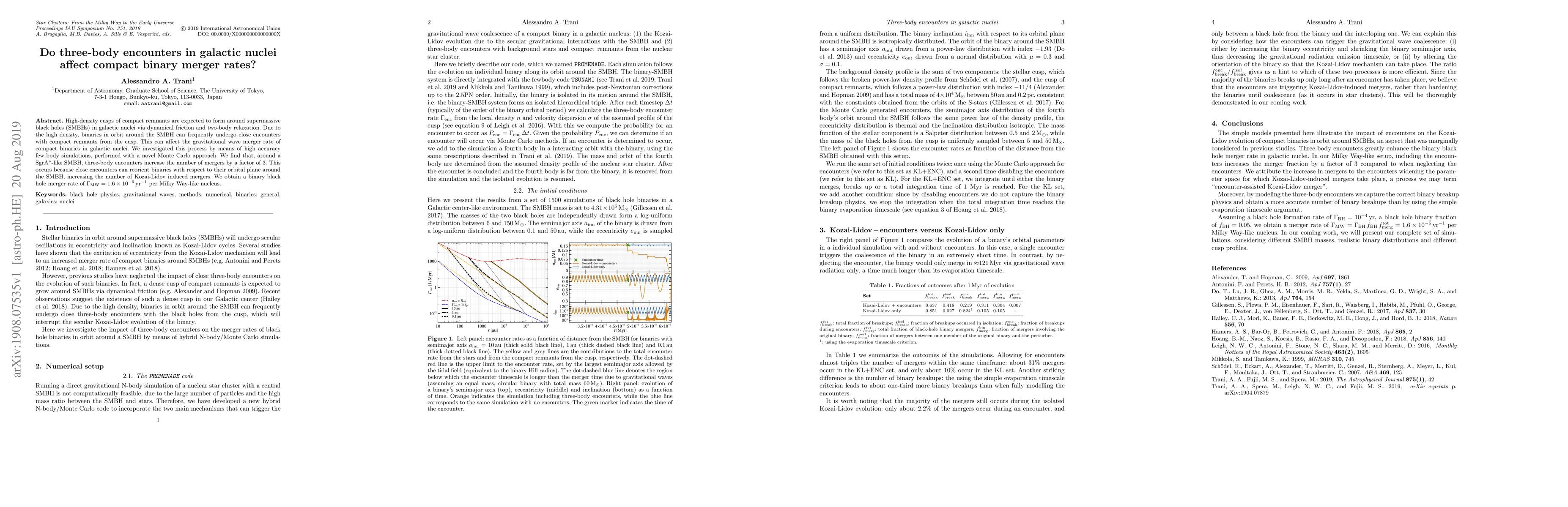 This study finds that three-body encounters in galactic nuclei significantly increase compact binary merger rates by reorienting binaries and enhancing Kozai-Lidov induced mergers, resulting in a merger rate of 1.6x10^-6/yr per Milky Way-like nucleus.