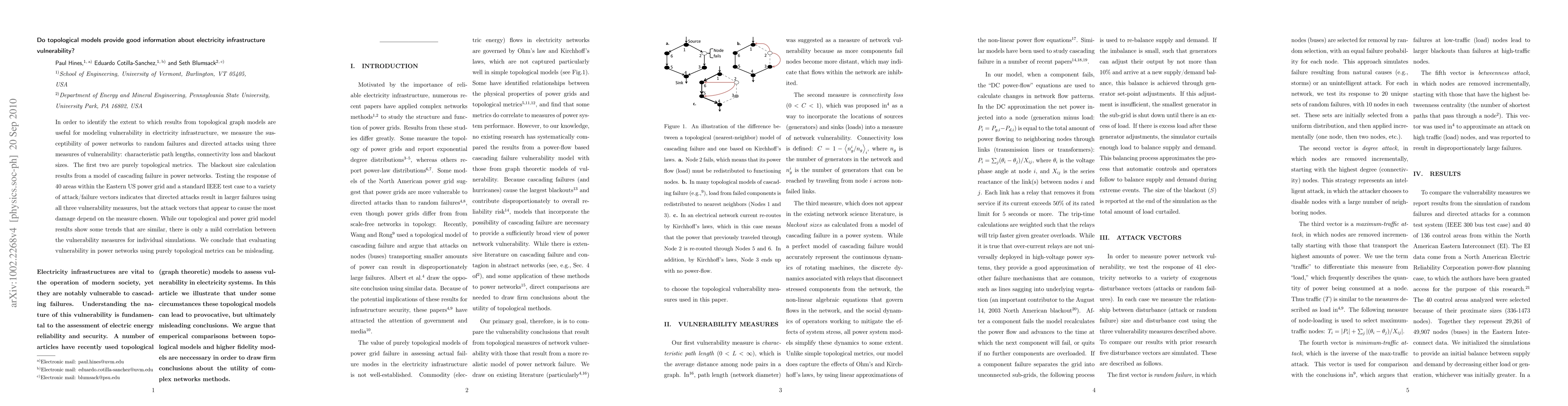 In order to identify the extent to which results from topological graph models are useful for modeling vulnerability in electricity infrastructure, we measure the susceptibility of power networks to random failures and directed attacks using three measures of vulnerability: characteristic path lengths, connectivity loss and blackout sizes. The first two are purely topological metrics. The blackout size calculation results from a model of cascading failure in power networks. Testing the response of 40 areas within the Eastern US power grid and a standard IEEE test case to a variety of attack/failure vectors indicates that directed attacks result in larger failures using all three vulnerability measures, but the attack vectors that appear to cause the most damage depend on the measure chosen. While our topological and power grid model results show some trends that are similar, there is only a mild correlation between the vulnerability measures for individual simulations. We conclude that evaluating vulnerability in power networks using purely topological metrics can be misleading.