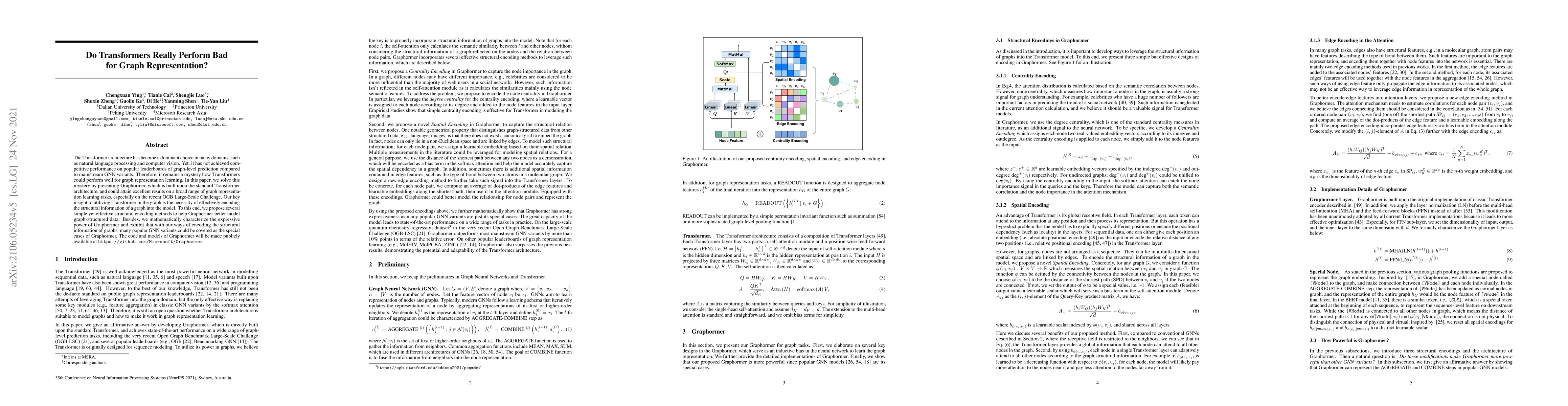 The Transformer architecture has become a dominant choice in many domains, such as natural language processing and computer vision. Yet, it has not achieved competitive performance on popular leaderboards of graph-level prediction compared to mainstream GNN variants. Therefore, it remains a mystery how Transformers could perform well for graph representation learning. In this paper, we solve this mystery by presenting Graphormer, which is built upon the standard Transformer architecture, and could attain excellent results on a broad range of graph representation learning tasks, especially on the recent OGB Large-Scale Challenge. Our key insight to utilizing Transformer in the graph is the necessity of effectively encoding the structural information of a graph into the model. To this end, we propose several simple yet effective structural encoding methods to help Graphormer better model graph-structured data. Besides, we mathematically characterize the expressive power of Graphormer and exhibit that with our ways of encoding the structural information of graphs, many popular GNN variants could be covered as the special cases of Graphormer.