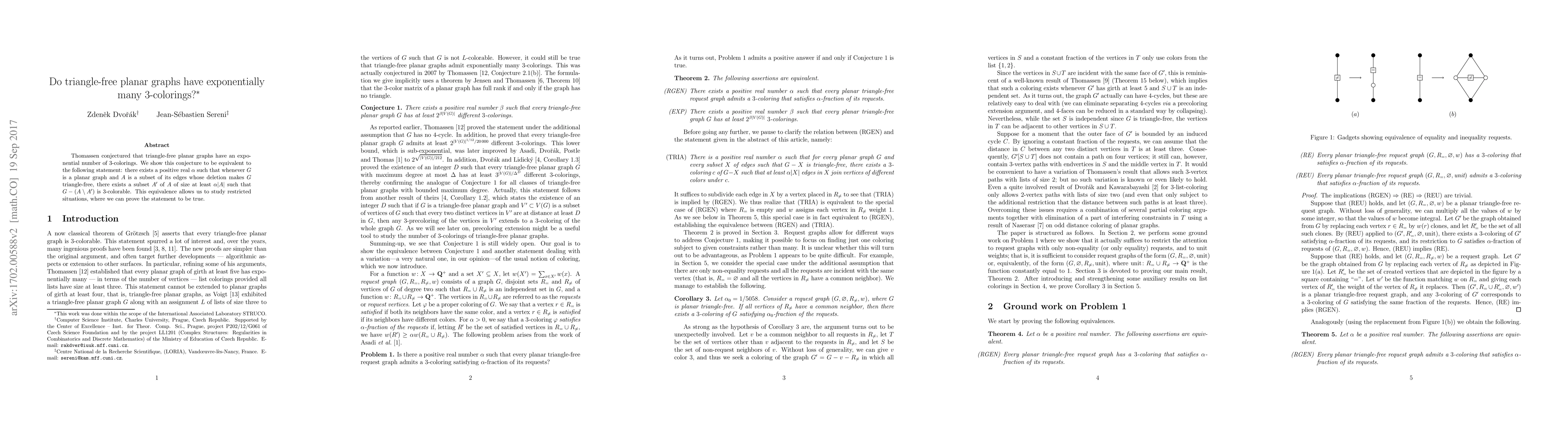 Thomassen's conjecture on triangle-free planar graphs having exponentially many 3-colorings is shown to be equivalent to a specific edge-deletion condition, allowing for restricted proofs of the conjecture's validity.