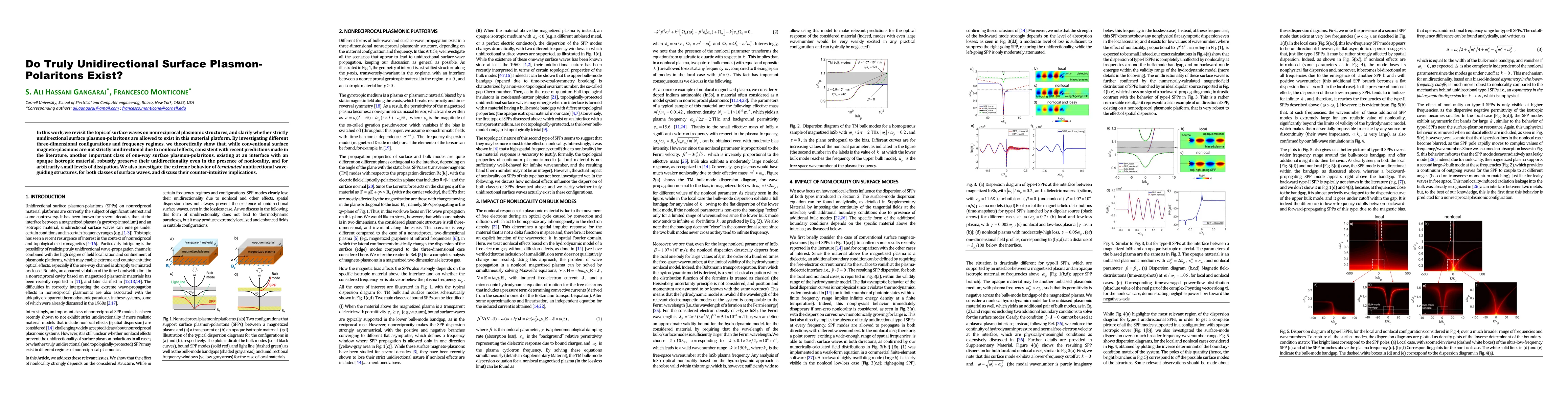 This paper explores the existence of truly unidirectional surface plasmon-polaritons in nonreciprocal plasmonic structures, finding that while conventional surface magneto-plasmons are not strictly unidirectional due to nonlocal effects, a distinct class of surface waves at opaque isotropic material interfaces maintains unidirectionality even with minimal dissipation.