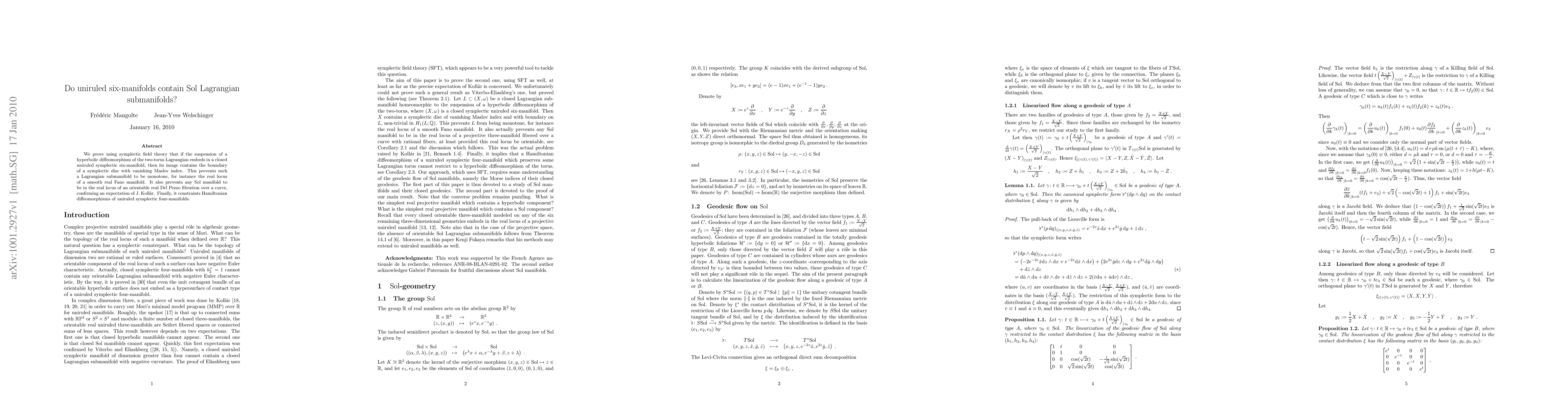 This paper demonstrates, via symplectic field theory, that uniruled six-manifolds cannot contain Sol Lagrangian submanifolds, thus refuting expectations regarding real loci of certain geometric structures. It also impacts the behavior of Hamiltonian diffeomorphisms in lower-dimensional cases.