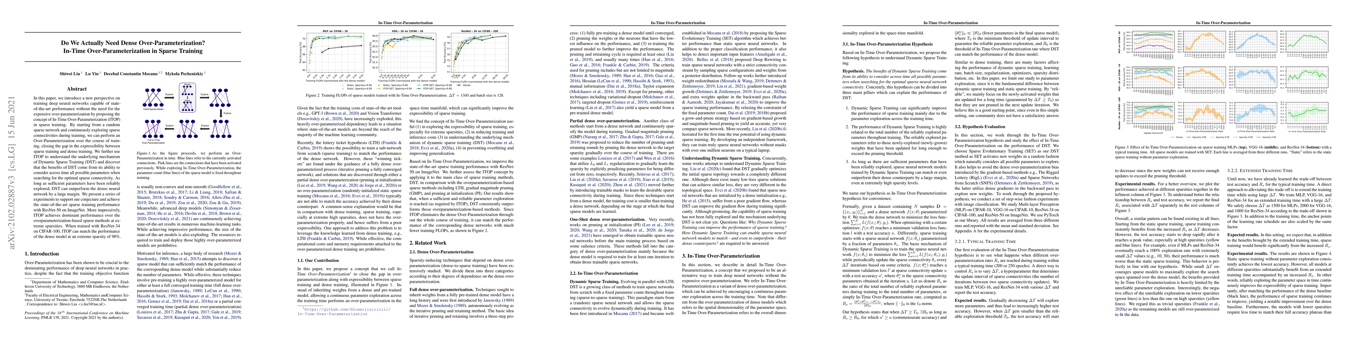 In this paper, we introduce a new perspective on training deep neural networks capable of state-of-the-art performance without the need for the expensive over-parameterization by proposing the concept of In-Time Over-Parameterization (ITOP) in sparse training. By starting from a random sparse network and continuously exploring sparse connectivities during training, we can perform an Over-Parameterization in the space-time manifold, closing the gap in the expressibility between sparse training and dense training. We further use ITOP to understand the underlying mechanism of Dynamic Sparse Training (DST) and indicate that the benefits of DST come from its ability to consider across time all possible parameters when searching for the optimal sparse connectivity. As long as there are sufficient parameters that have been reliably explored during training, DST can outperform the dense neural network by a large margin. We present a series of experiments to support our conjecture and achieve the state-of-the-art sparse training performance with ResNet-50 on ImageNet. More impressively, our method achieves dominant performance over the overparameterization-based sparse methods at extreme sparsity levels. When trained on CIFAR-100, our method can match the performance of the dense model even at an extreme sparsity (98%). Code can be found https://github.com/Shiweiliuiiiiiii/In-Time-Over-Parameterization.