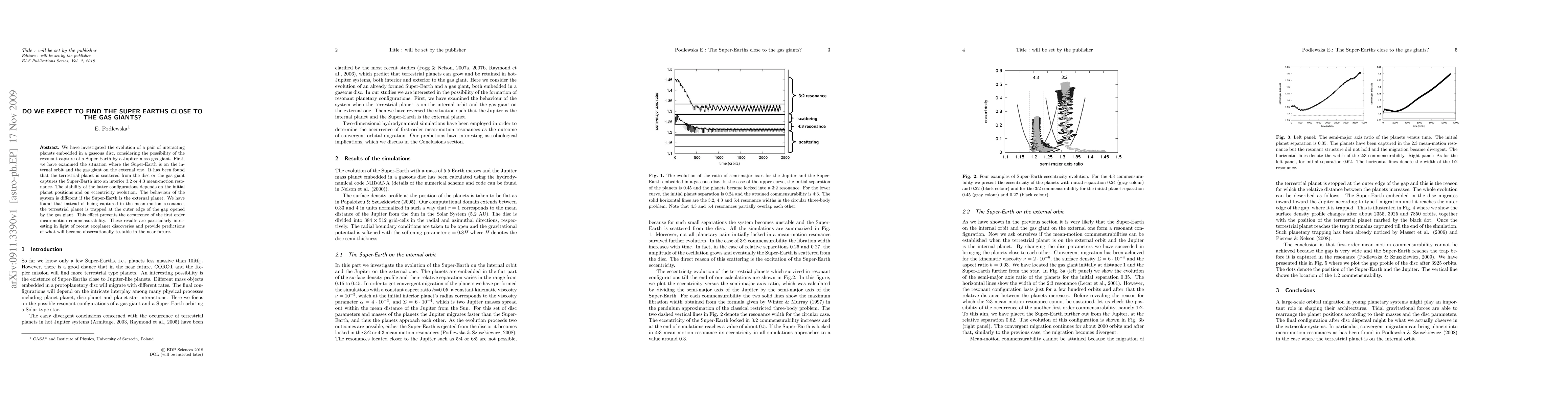 We have investigated the evolution of a pair of interacting planets embedded in a gaseous disc, considering the possibility of the resonant capture of a Super-Earth by a Jupiter mass gas giant. First, we have examined the situation where the Super-Earth is on the internal orbit and the gas giant on the external one. It has been found that the terrestrial planet is scattered from the disc or the gas giant captures the Super-Earth into an interior 3:2 or 4:3 mean-motion resonance. The stability of the latter configurations depends on the initial planet positions and on eccentricity evolution. The behaviour of the system is different if the Super-Earth is the external planet. We have found that instead of being captured in the mean-motion resonance, the terrestrial planet is trapped at the outer edge of the gap opened by the gas giant. This effect prevents the occurrence of the first order mean-motion commensurability. These results are particularly interesting in light of recent exoplanet discoveries and provide predictions of what will become observationally testable in the near future.