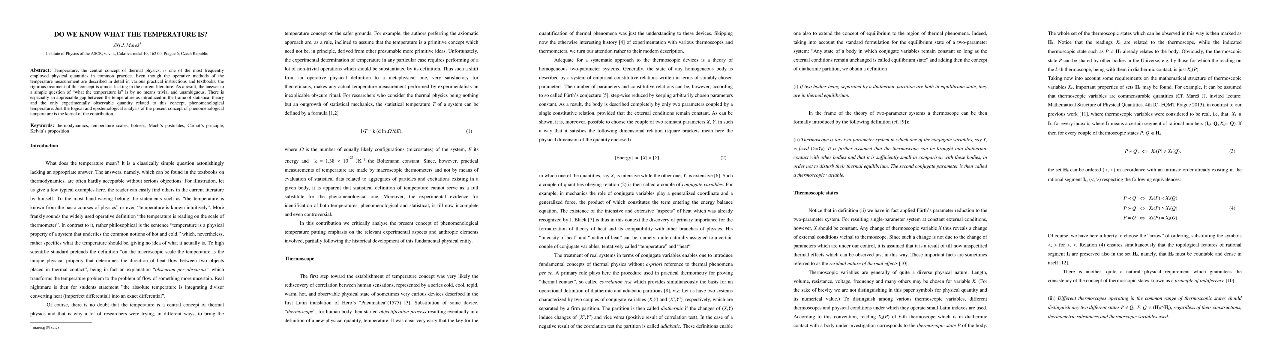 Temperature, the central concept of thermal physics, is one of the most frequently employed physical quantities in common practice. Even though the operative methods of the temperature measurement are described in detail in various practical instructions and textbooks, the rigorous treatment of this concept is almost lacking in the current literature. As a result, the answer to a simple question of "what the temperature is" is by no means trivial and unambiguous. There is especially an appreciable gap between the temperature as introduced in the frame of statistical theory and the only experimentally observable quantity related to this concept, phenomenological temperature. Just the logical and epistemological analysis of the present concept of phenomenological temperature is the kernel of the contribution.