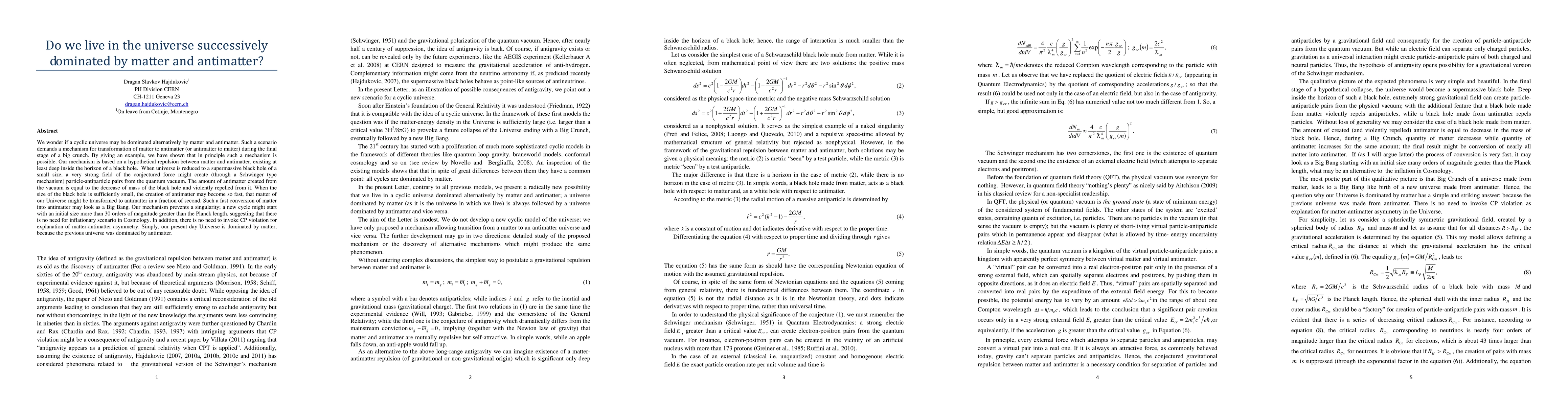 We wonder if a cyclic universe may be dominated alternatively by matter and antimatter. Such a scenario demands a mechanism for transformation of matter to antimatter (or antimatter to matter) during the final stage of a big crunch. By giving an example, we have shown that in principle such a mechanism is possible. Our mechanism is based on a hypothetical repulsion between matter and antimatter, existing at least deep inside the horizon of a black hole. When universe is reduced to a supermassive black hole of a small size, a very strong field of the conjectured force might create (through a Schwinger type mechanism) particle-antiparticle pairs from the quantum vacuum. The amount of antimatter created from the vacuum is equal to the decrease of mass of the black hole and violently repelled from it. When the size of the black hole is sufficiently small, the creation of antimatter may become so fast, that matter of our Universe might be transformed to antimatter in a fraction of second. Such a fast conversion of matter into antimatter may look as a Big Bang. Our mechanism prevents a singularity; a new cycle might start with an initial size more than 30 orders of magnitude greater than the Planck length, suggesting that there is no need for inflationary scenario in Cosmology. In addition, there is no need to invoke CP violation for explanation of matter-antimatter asymmetry. Simply, our present day Universe is dominated by matter, because the previous universe was dominated by antimatter.