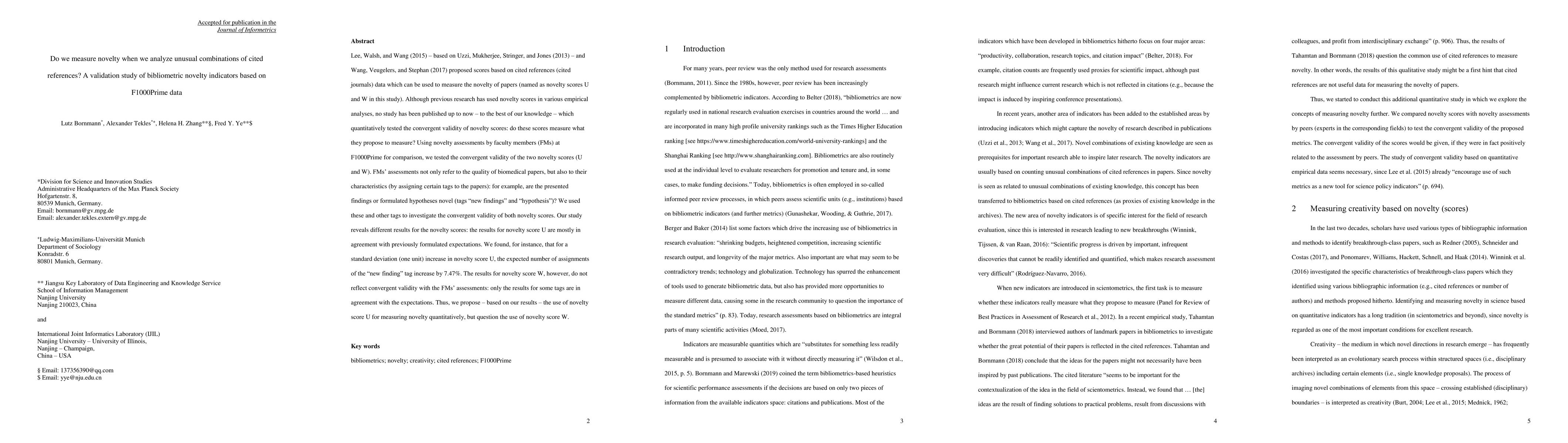 Lee, Walsh, and Wang (2015) - based on Uzzi, Mukherjee, Stringer, and Jones (2013) - and Wang, Veugelers, and Stephan (2017) proposed scores based on cited references (cited journals) data which can be used to measure the novelty of papers (named as novelty scores U and W in this study). Although previous research has used novelty scores in various empirical analyses, no study has been published up to now - to the best of our knowledge - which quantitatively tested the convergent validity of novelty scores: do these scores measure what they propose to measure? Using novelty assessments by faculty members (FMs) at F1000Prime for comparison, we tested the convergent validity of the two novelty scores (U and W). FMs' assessments not only refer to the quality of biomedical papers, but also to their characteristics (by assigning certain tags to the papers): for example, are the presented findings or formulated hypotheses novel (tags "new findings" and "hypothesis")? We used these and other tags to investigate the convergent validity of both novelty scores. Our study reveals different results for the novelty scores: the results for novelty score U are mostly in agreement with previously formulated expectations. We found, for instance, that for a standard deviation (one unit) increase in novelty score U, the expected number of assignments of the "new finding" tag increase by 7.47%. The results for novelty score W, however, do not reflect convergent validity with the FMs' assessments: only the results for some tags are in agreement with the expectations. Thus, we propose - based on our results - the use of novelty score U for measuring novelty quantitatively, but question the use of novelty score W.