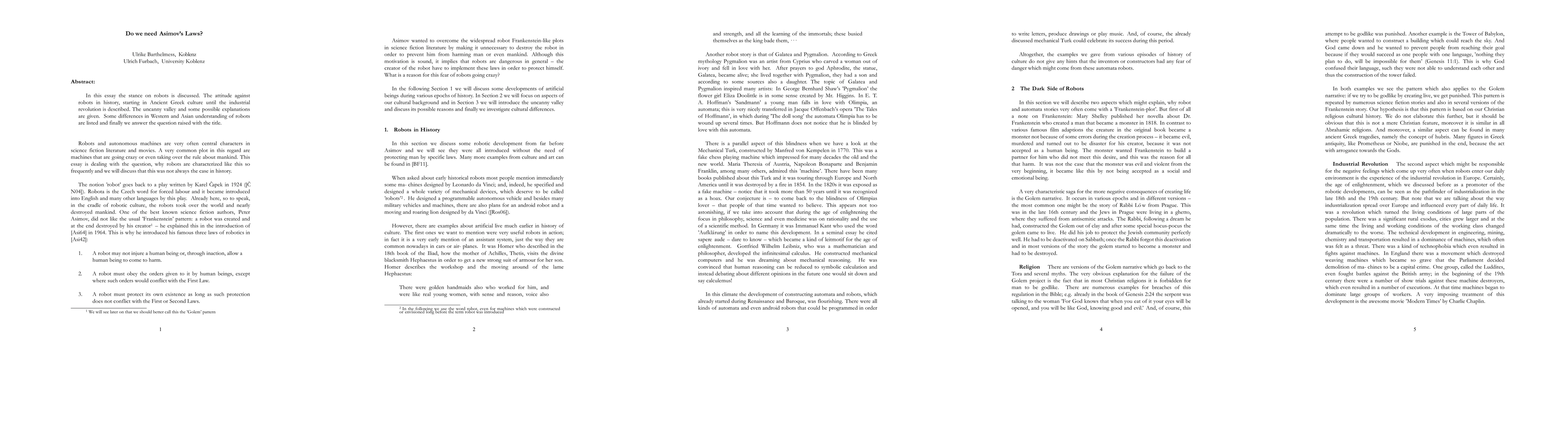 In this essay the stance on robots is discussed. The attitude against robots in history, starting in Ancient Greek culture until the industrial revolution is described. The uncanny valley and some possible explanations are given. Some differences in Western and Asian understanding of robots are listed and finally we answer the question raised with the title.