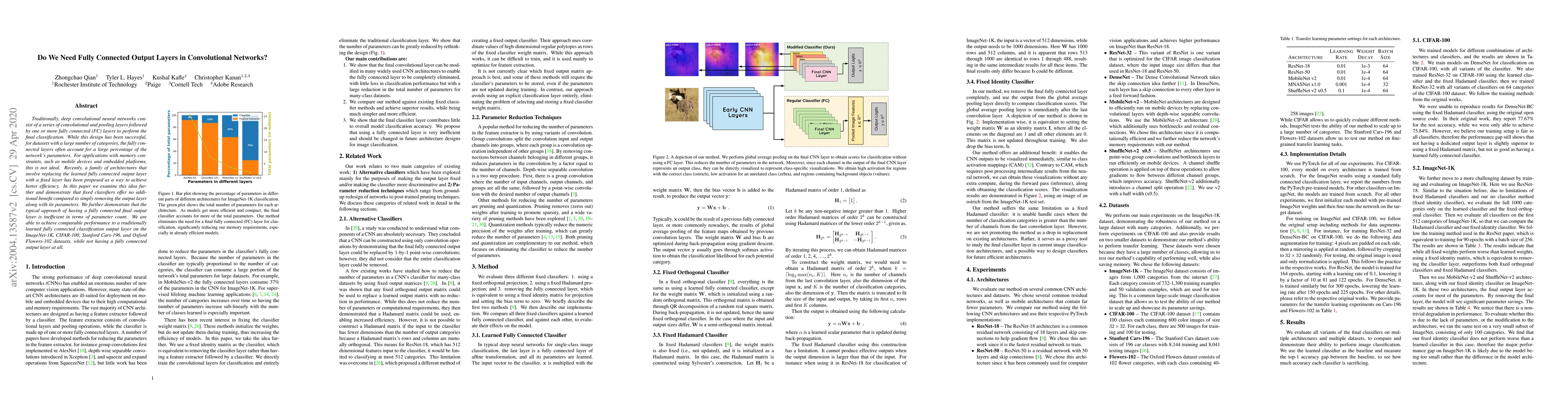 Traditionally, deep convolutional neural networks consist of a series of convolutional and pooling layers followed by one or more fully connected (FC) layers to perform the final classification. While this design has been successful, for datasets with a large number of categories, the fully connected layers often account for a large percentage of the network's parameters. For applications with memory constraints, such as mobile devices and embedded platforms, this is not ideal. Recently, a family of architectures that involve replacing the learned fully connected output layer with a fixed layer has been proposed as a way to achieve better efficiency. In this paper we examine this idea further and demonstrate that fixed classifiers offer no additional benefit compared to simply removing the output layer along with its parameters. We further demonstrate that the typical approach of having a fully connected final output layer is inefficient in terms of parameter count. We are able to achieve comparable performance to a traditionally learned fully connected classification output layer on the ImageNet-1K, CIFAR-100, Stanford Cars-196, and Oxford Flowers-102 datasets, while not having a fully connected output layer at all.