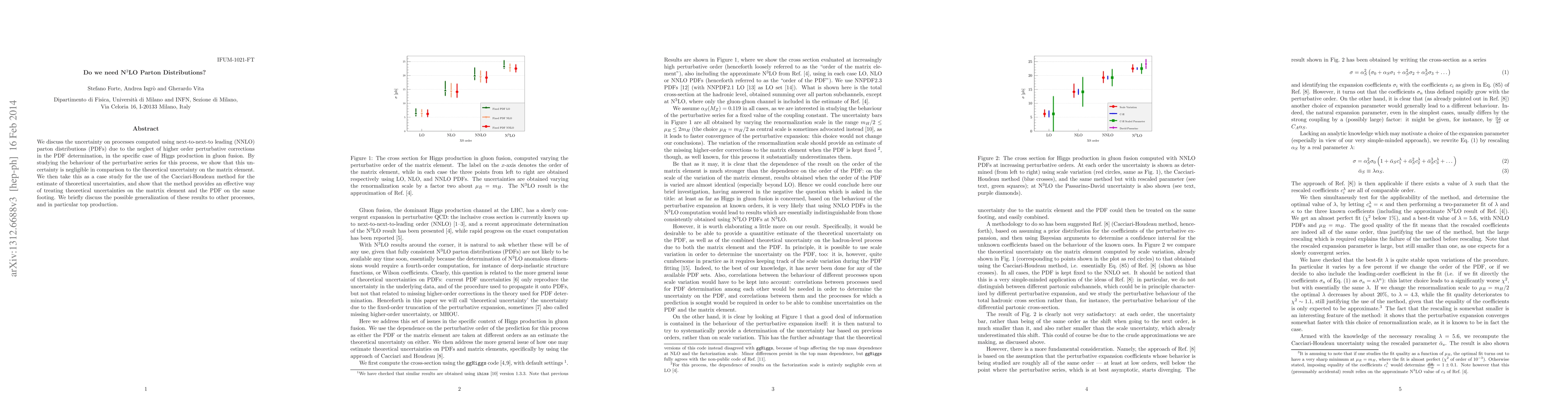 We discuss the uncertainty on processes computed using next-to-next-to leading (NNLO) parton distributions (PDFs) due to the neglect of higher order perturbative corrections in the PDF determination, in the specific case of Higgs production in gluon fusion. By studying the behaviour of the perturbative series for this process, we show that this uncertainty is negligible in comparison to the theoretical uncertainty on the matrix element. We then take this as a case study for the use of the Cacciari-Houdeau method for the estimate of theoretical uncertainties, and show that the method provides an effective way of treating theoretical uncertainties on the matrtix element and the PDF on the same footing.