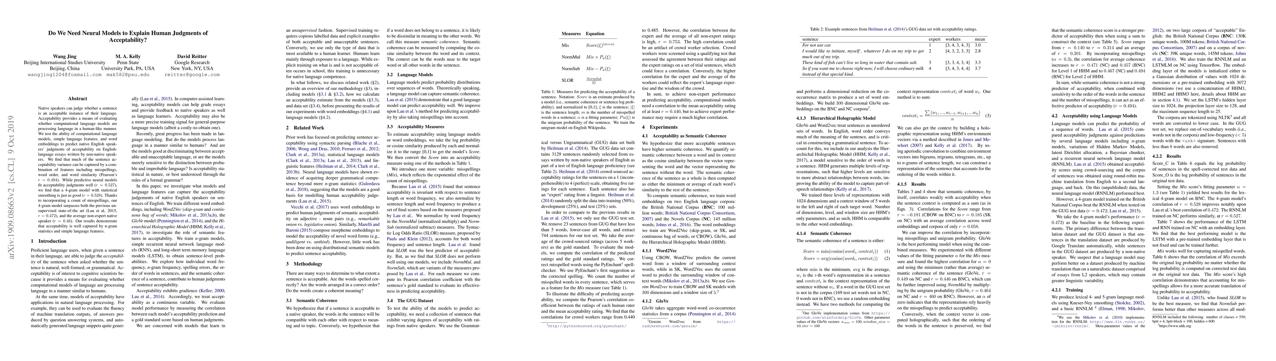 Native speakers can judge whether a sentence is an acceptable instance of their language. Acceptability provides a means of evaluating whether computational language models are processing language in a human-like manner. We test the ability of computational language models, simple language features, and word embeddings to predict native English speakers judgments of acceptability on English-language essays written by non-native speakers. We find that much of the sentence acceptability variance can be captured by a combination of features including misspellings, word order, and word similarity (Pearson's r = 0.494). While predictive neural models fit acceptability judgments well (r = 0.527), we find that a 4-gram model with statistical smoothing is just as good (r = 0.528). Thanks to incorporating a count of misspellings, our 4-gram model surpasses both the previous unsupervised state-of-the art (Lau et al., 2015; r = 0.472), and the average non-expert native speaker (r = 0.46). Our results demonstrate that acceptability is well captured by n-gram statistics and simple language features.