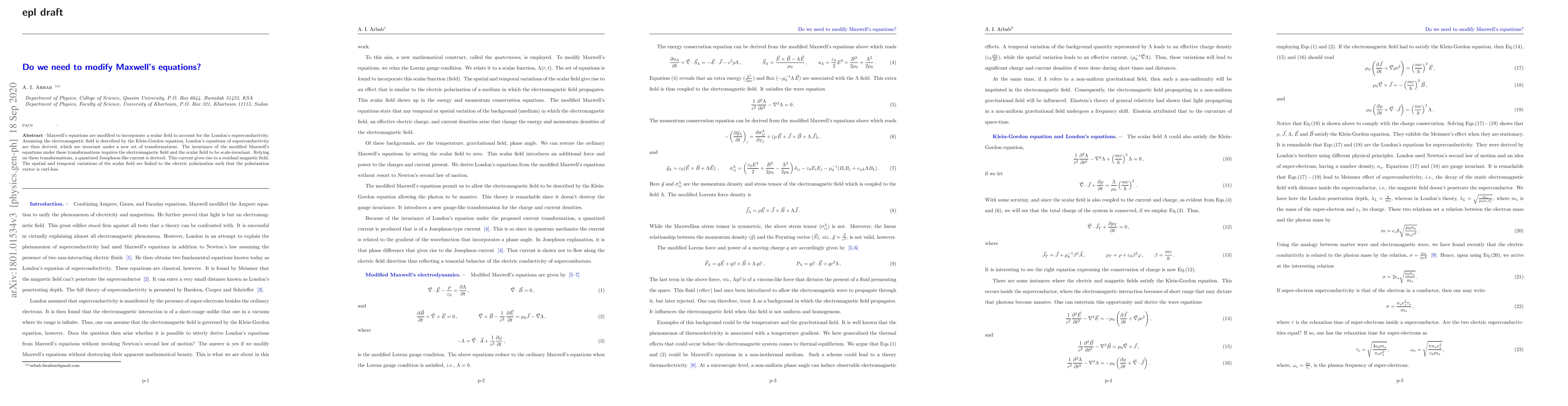 Maxwell's equations are modified to incorporate a scalar field to account for the London's superconductivity. Assuming the electromagnetic field is described by the Klein-Gordon equation, London's equations of superconductivity are then derived, which are invariant under a new set of transformations. The invariance of the modified Maxwell's equations under these transformations requires the electromagnetic field and the scalar field to be scale-invariant. Relying on these transformations, a quantized Josephson-like current is derived. This current gives rise to a residual magnetic field. The spatial and temporal variations of the scalar field are linked to the electric polarization such that the polarization vector is curl-less.