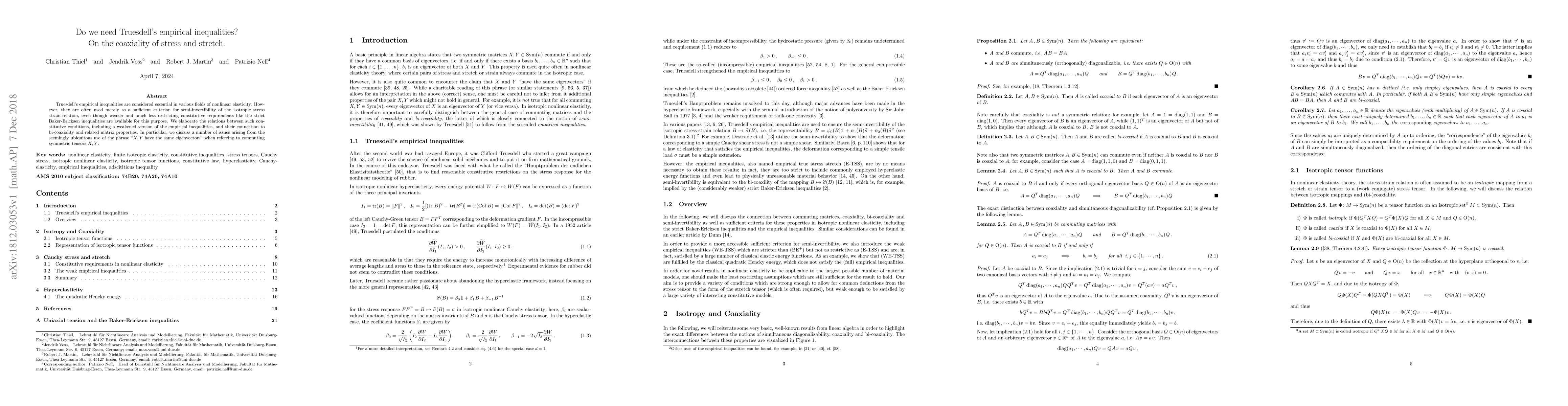 Truesdell's empirical inequalities are considered essential in various fields of nonlinear elasticity. However, they are often used merely as a sufficient criterion for semi-invertibility of the isotropic stress strain-relation, even though weaker and much less restricting constitutive requirements like the strict Baker-Ericksen inequalities are available for this purpose. We elaborate the relations between such constitutive conditions, including a weakened version of the empirical inequalities, and their connection to bi-coaxiality and related matrix properties. In particular, we discuss a number of issues arising from the seemingly ubiquitous use of the phrase "$X,Y$ have the same eigenvectors" when referring to commuting symmetric tensors $X,Y$.