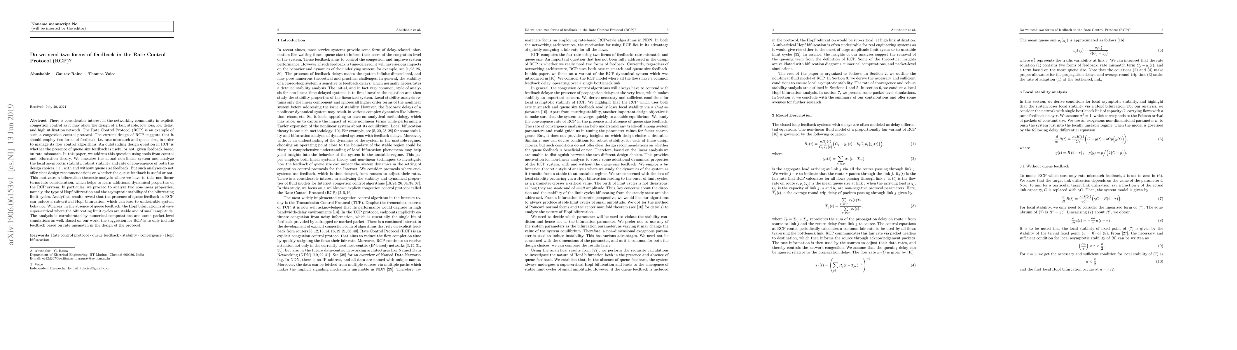 This paper investigates the necessity of queue size feedback in the Rate Control Protocol (RCP) by analyzing its dynamical properties using control and bifurcation theory. The results suggest that queue feedback can induce undesirable sub-critical Hopf bifurcations, while rate mismatch feedback leads to stable, super-critical bifurcations, recommending the exclusion of queue size feedback in RCP.