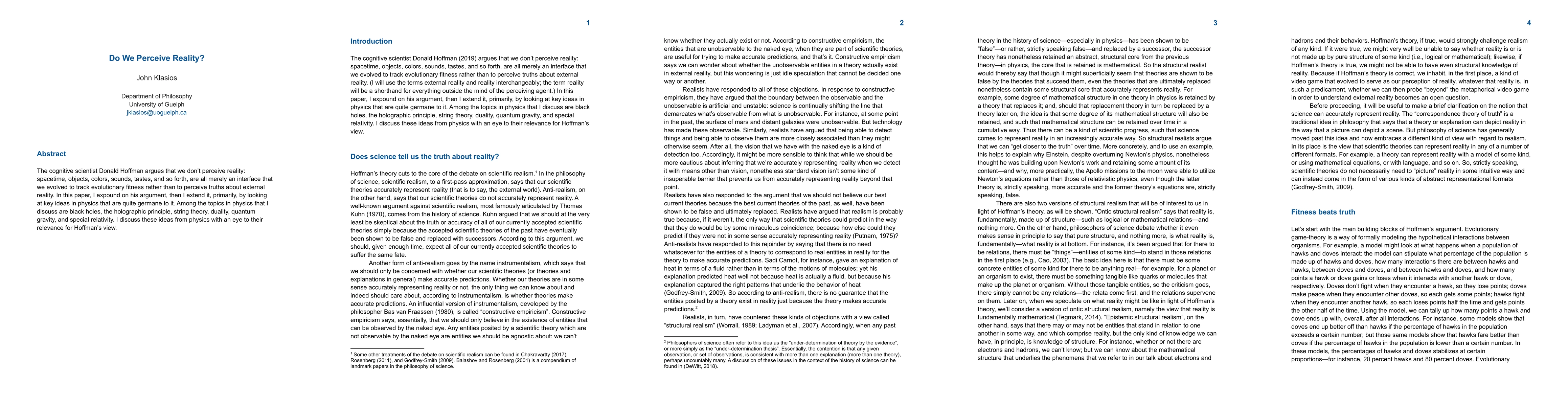 This paper explores Donald Hoffman's theory that our perception of reality is an evolved interface for fitness tracking rather than a truthful representation of external reality. It extends Hoffman's argument by incorporating key physics concepts like black holes, the holographic principle, and string theory to support the idea that our perception may not align with objective reality.