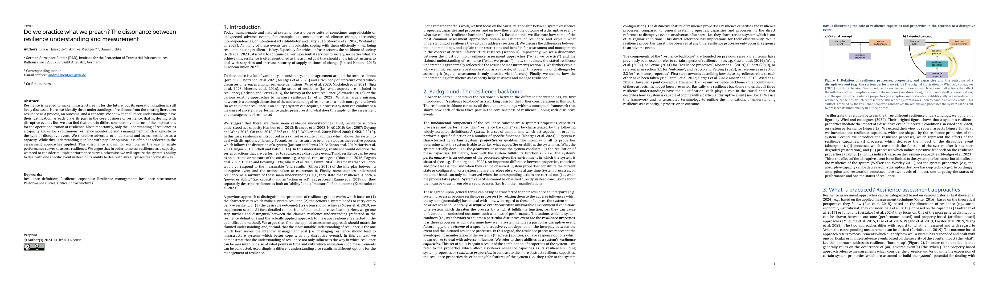 The paper discusses three conceptualizations of resilience: as a process, an outcome, and a capacity, highlighting their roles in managing disruptive events. It advocates for resilience as a capacity for continuous monitoring and event-agnostic management, noting a dissonance between this understanding and current assessment methods like single performance curves, which fail to capture resilience's full potential.