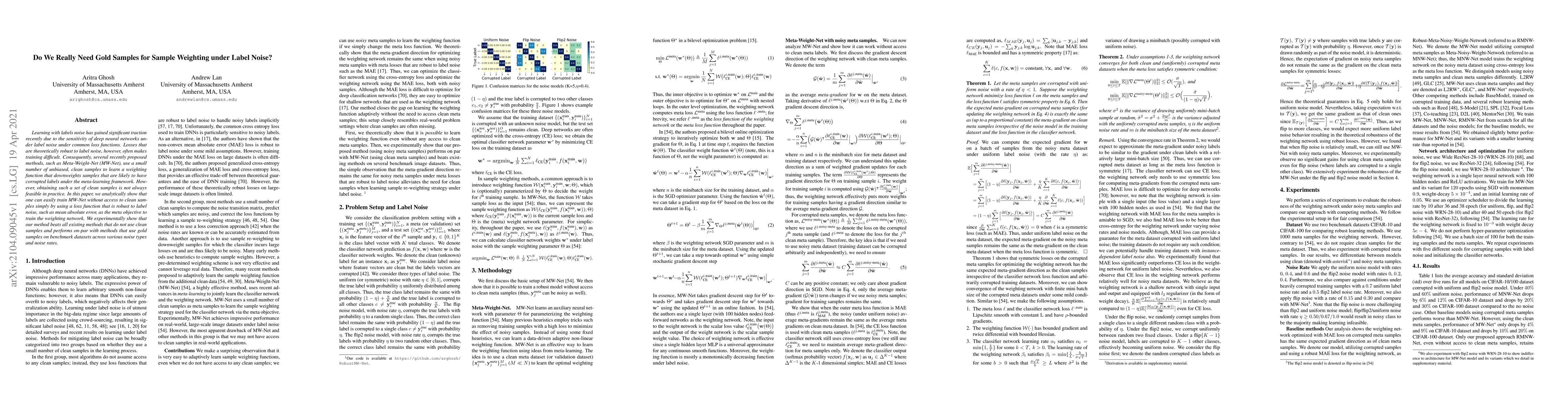 Researchers show that using a robust loss function can train a weighting network without gold samples, achieving comparable performance to methods that use clean samples or gold samples.