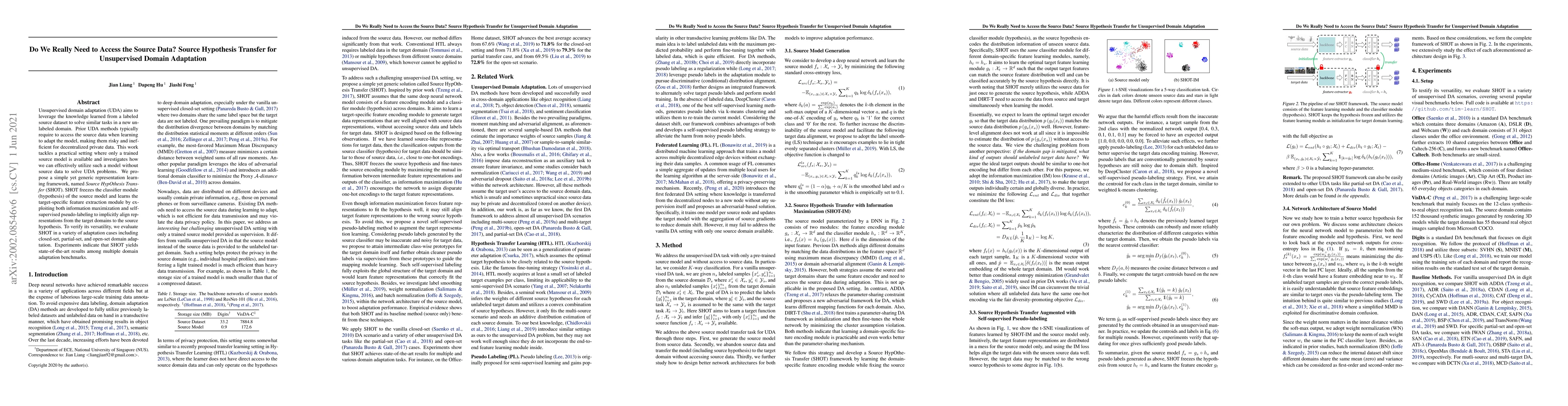 This paper proposes a method called Source Hypothesis Transfer (SHOT) to achieve unsupervised domain adaptation without needing access to the source data. SHOT leverages a pre-trained source model to implicitly align target domain representations, achieving state-of-the-art results across various adaptation scenarios.