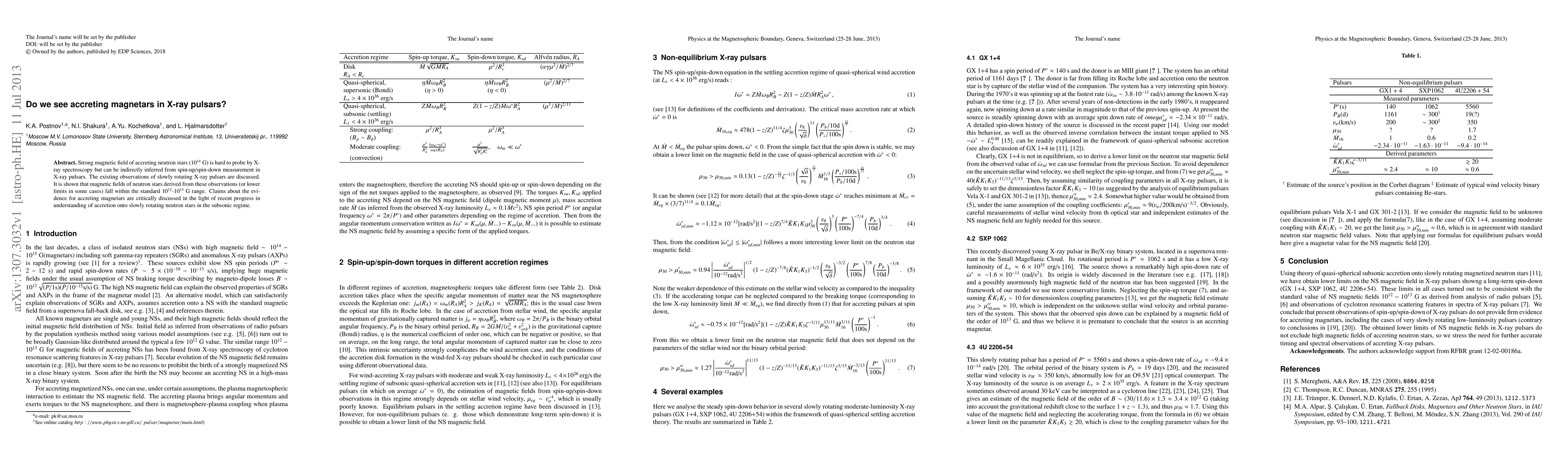 Strong magnetic field of accreting neutron stars ($10^{14}$ G) is hard to probe by X-ray spectroscopy but can be indirectly inferred from spin-up/spin-down measurement in X-ray pulsars. The existing observations of slowly rotating X-ray pulsars are discussed. It is shown that magnetic fields of neutron stars derived from these observations (or lower limits in some cases) fall within the standard $10^{12}$-$10^{13}$ G range. Claims about the evidence for accreting magnetars are critically discussed in the light of recent progress in understanding of accretion onto slowly rotating neutron stars in the subsonic regime.