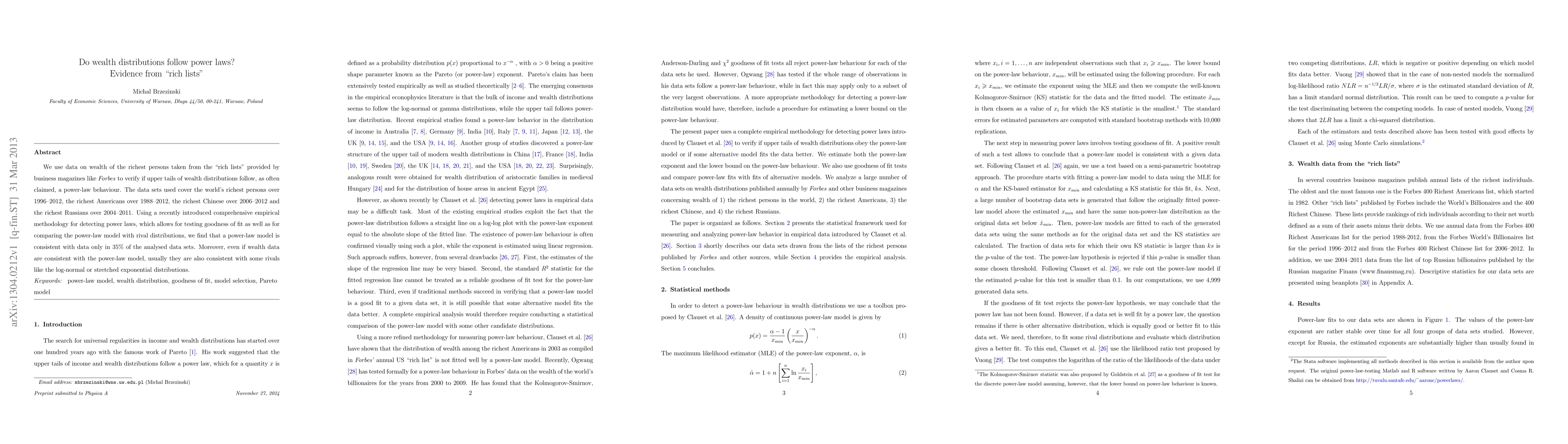 We use data on wealth of the richest persons taken from the "rich lists" provided by business magazines like Forbes to verify if upper tails of wealth distributions follow, as often claimed, a power-law behaviour. The data sets used cover the world's richest persons over 1996-2012, the richest Americans over 1988-2012, the richest Chinese over 2006-2012 and the richest Russians over 2004-2011. Using a recently introduced comprehensive empirical methodology for detecting power laws, which allows for testing goodness of fit as well as for comparing the power-law model with rival distributions, we find that a power-law model is consistent with data only in 35% of the analysed data sets. Moreover, even if wealth data are consistent with the power-law model, usually they are also consistent with some rivals like the log-normal or stretched exponential distributions.